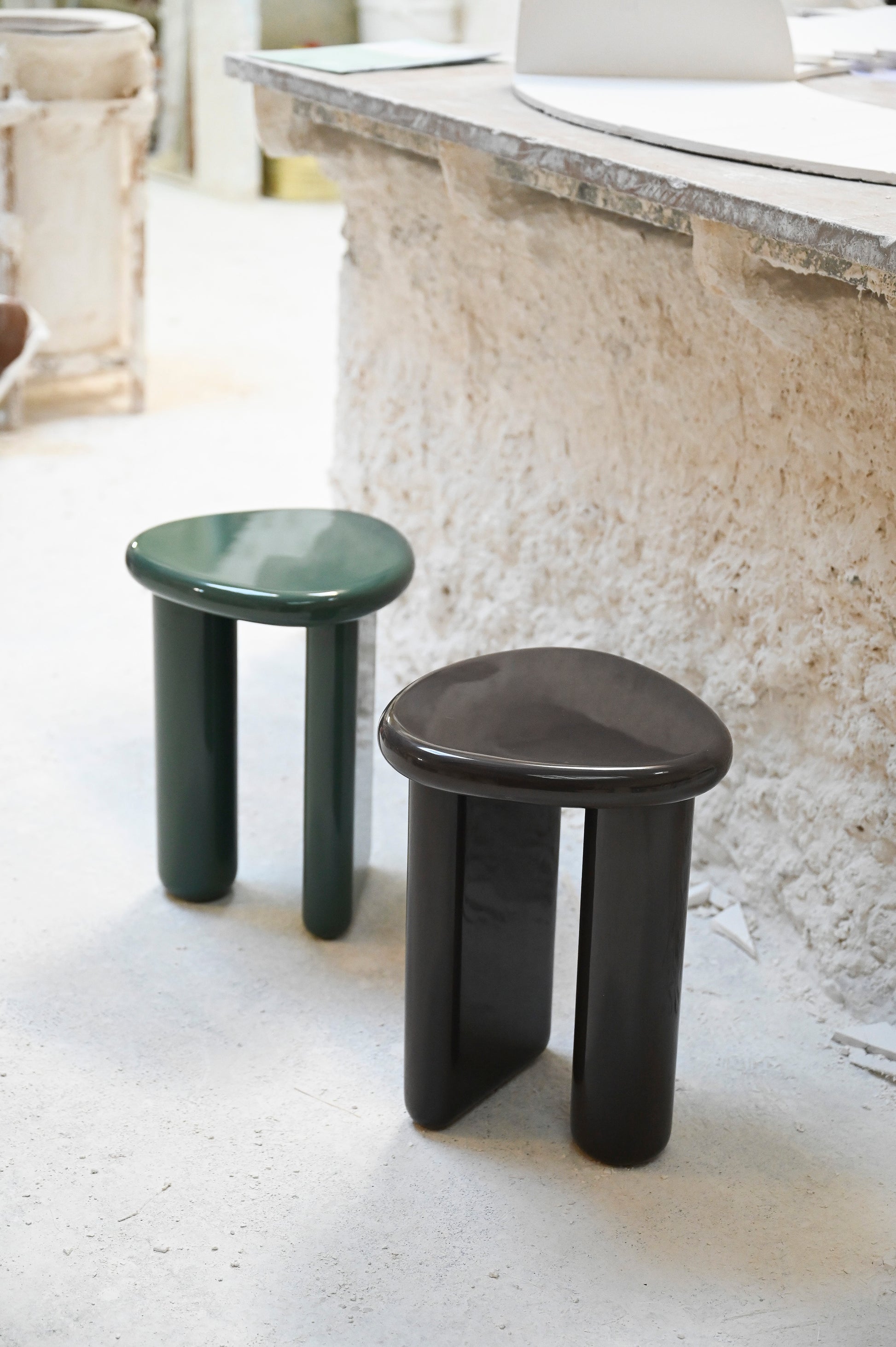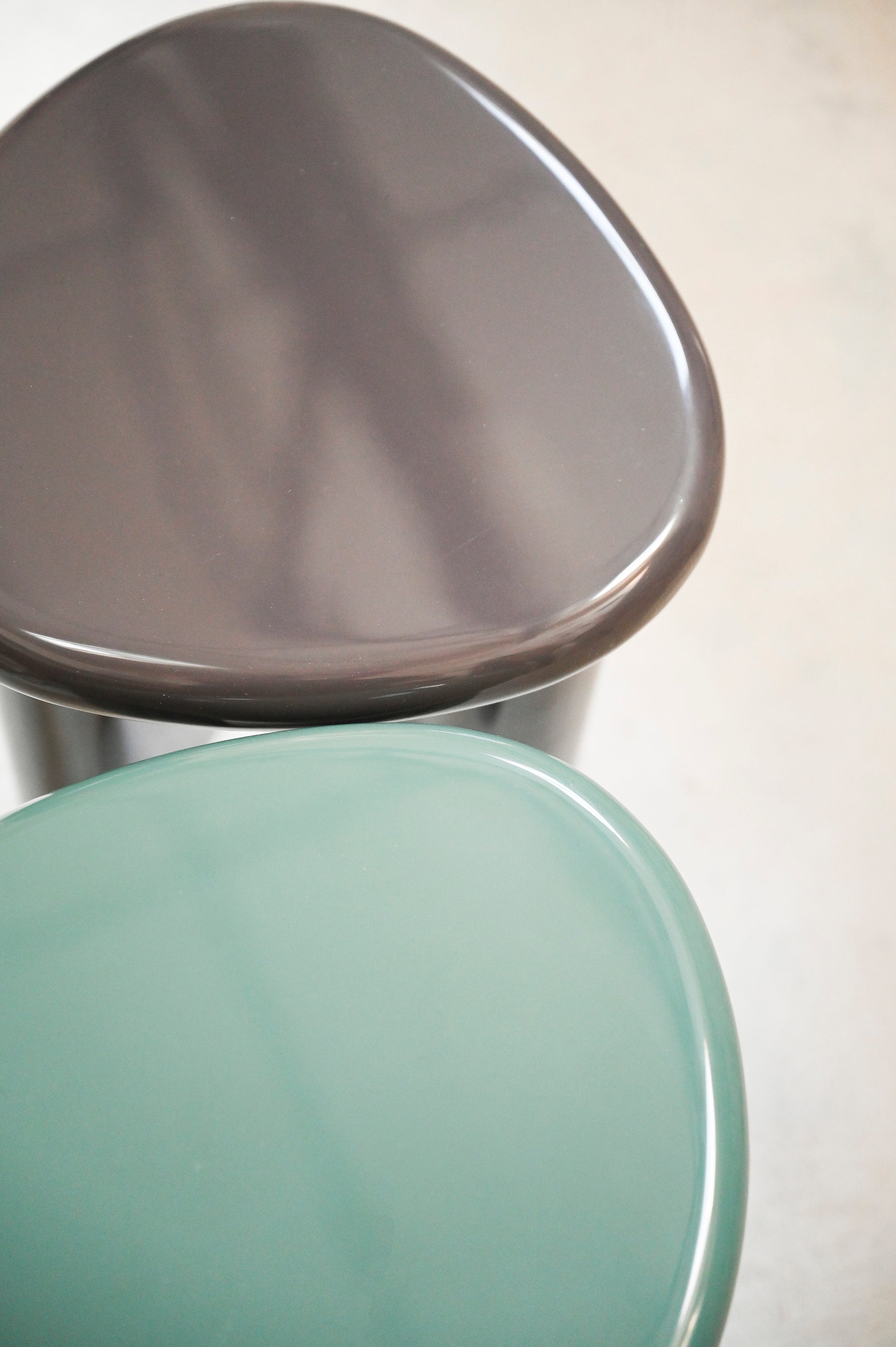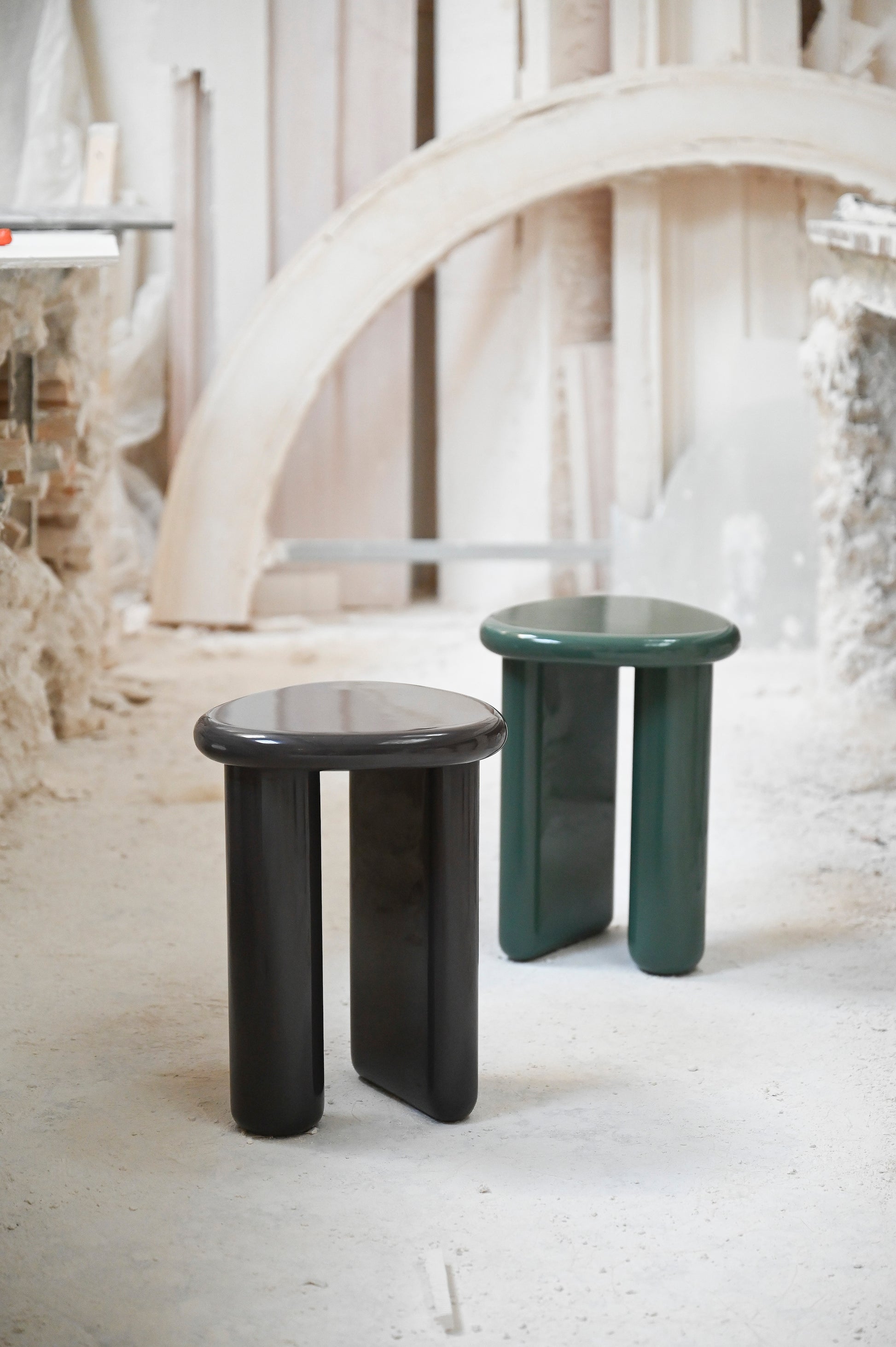 L'asymétrie de ses pieds, la forme organique de son plateau en bois laqué et sa douce couleur noir Antique, avec de légers reflets violets, lui confèrent un design singulier et versatile.