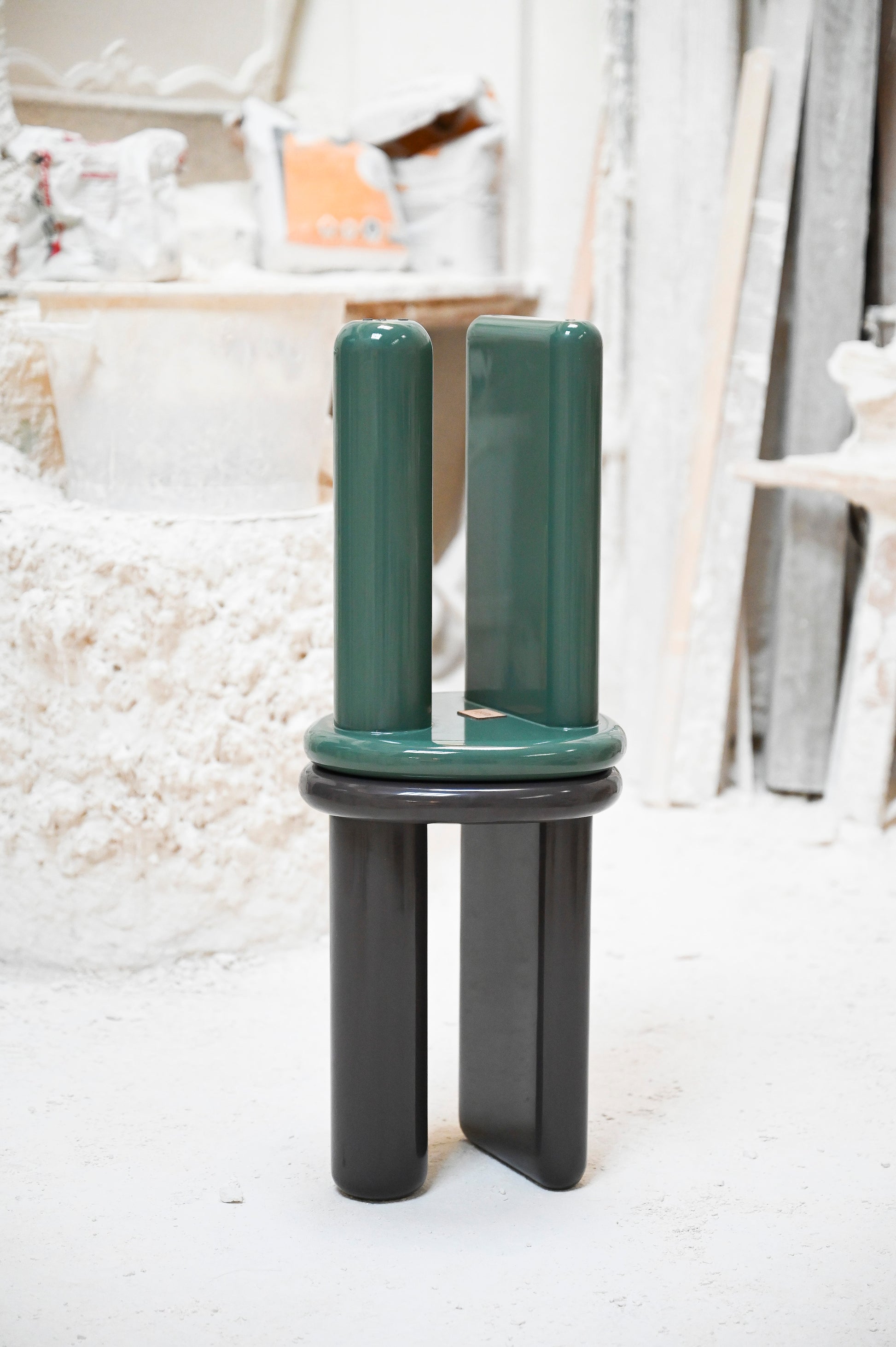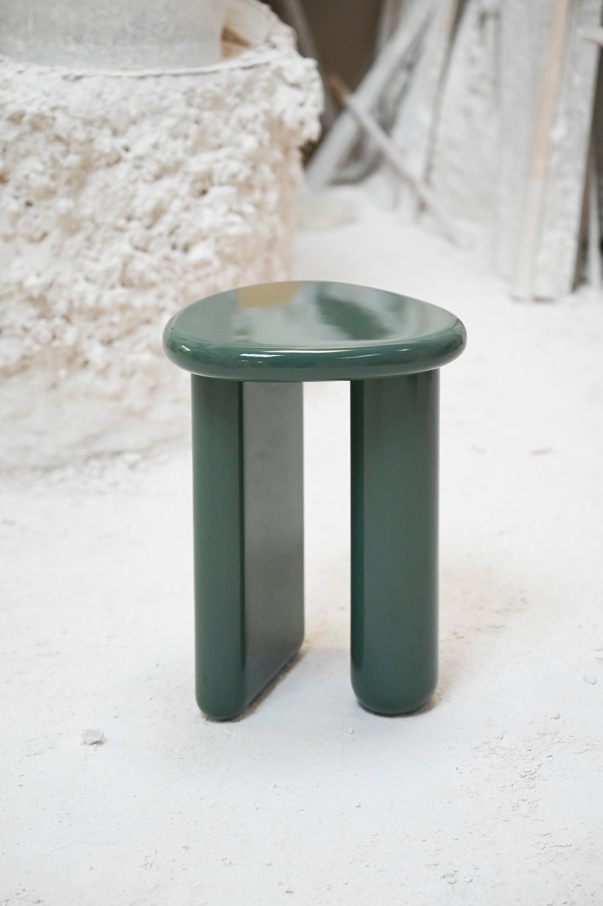 L'asymétrie de ses pieds, la forme organique de son plateau en bois laqué et sa douce couleur vert d'Égypte lui confèrent un design singulier et versatile.