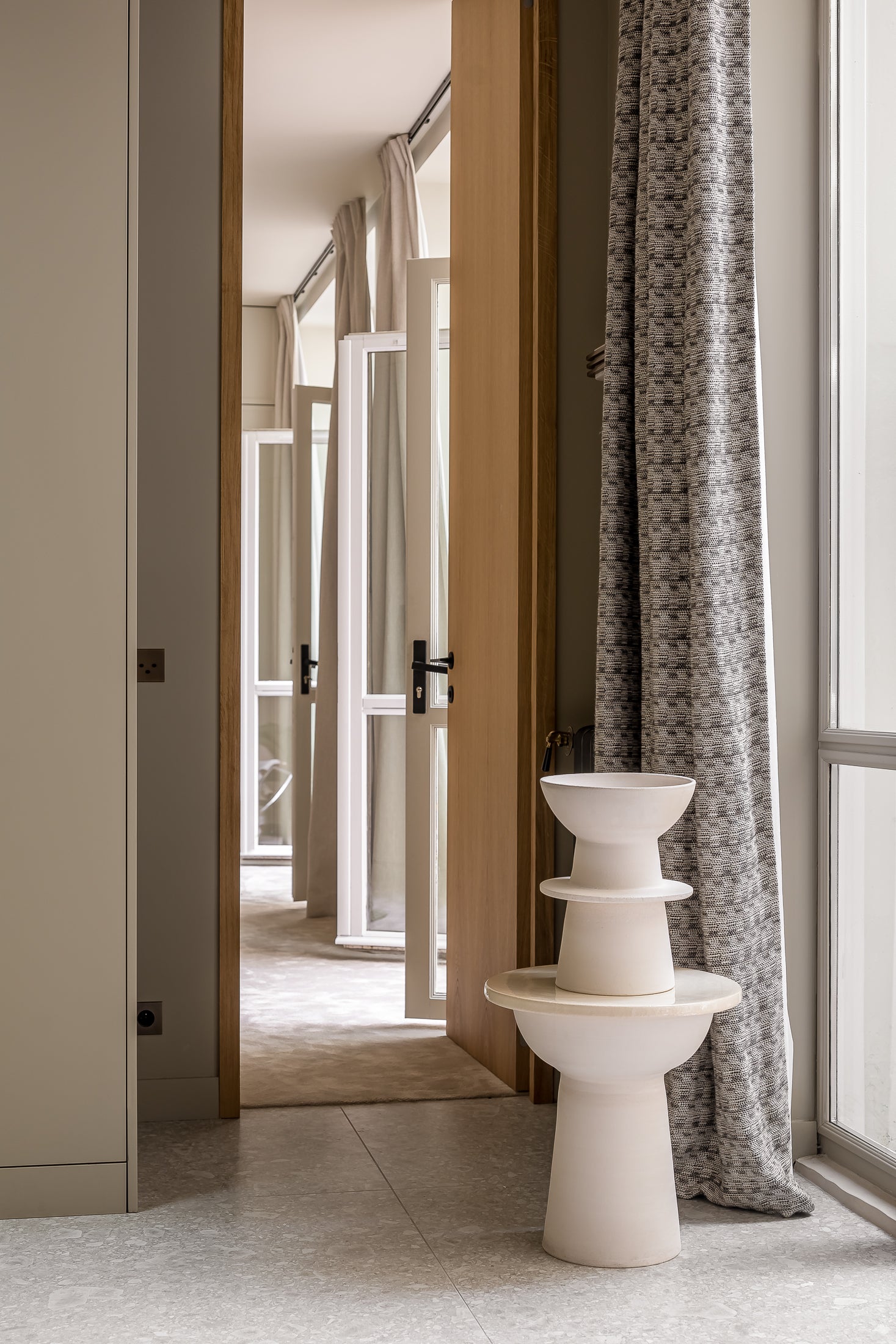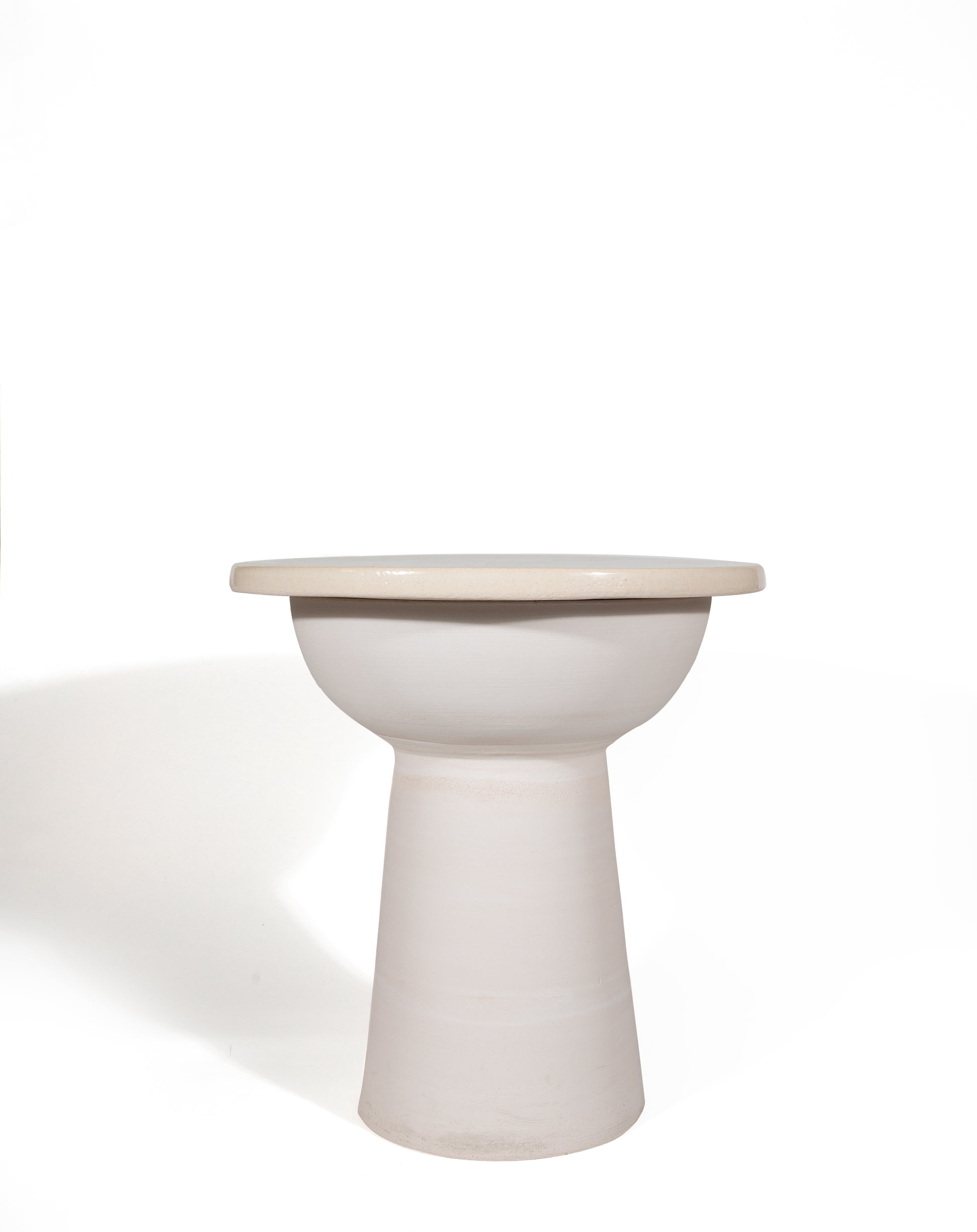 Pour jouer avec les contrastes, le plateau est recouvert d’un émail transparent qui se distingue de la partie basse de la table laissée brut. Son design fait dialoguer courbes et lignes droites et devient une sculpture.