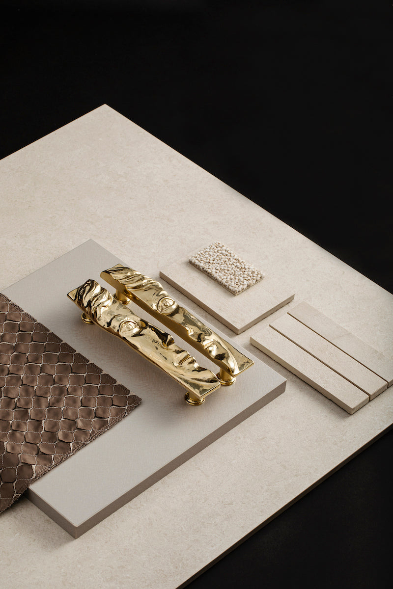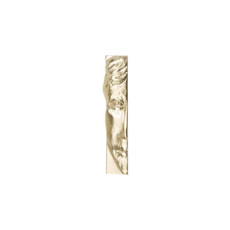 La poignée de meuble en laiton He représente un visage d'homme minutieusement sculpté. Sculpté à la main et coulé, le design de l'objet est directement inspiré de sculptures antiques.