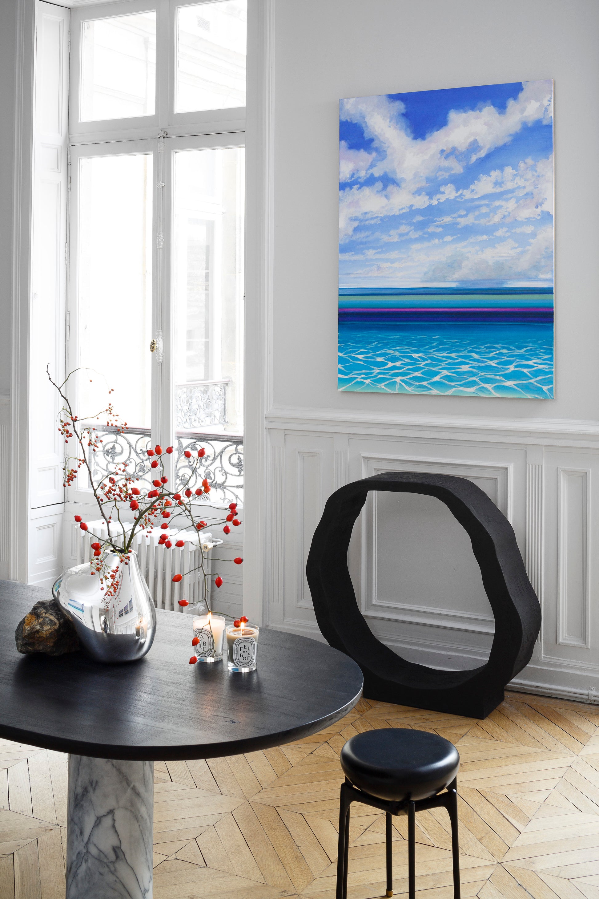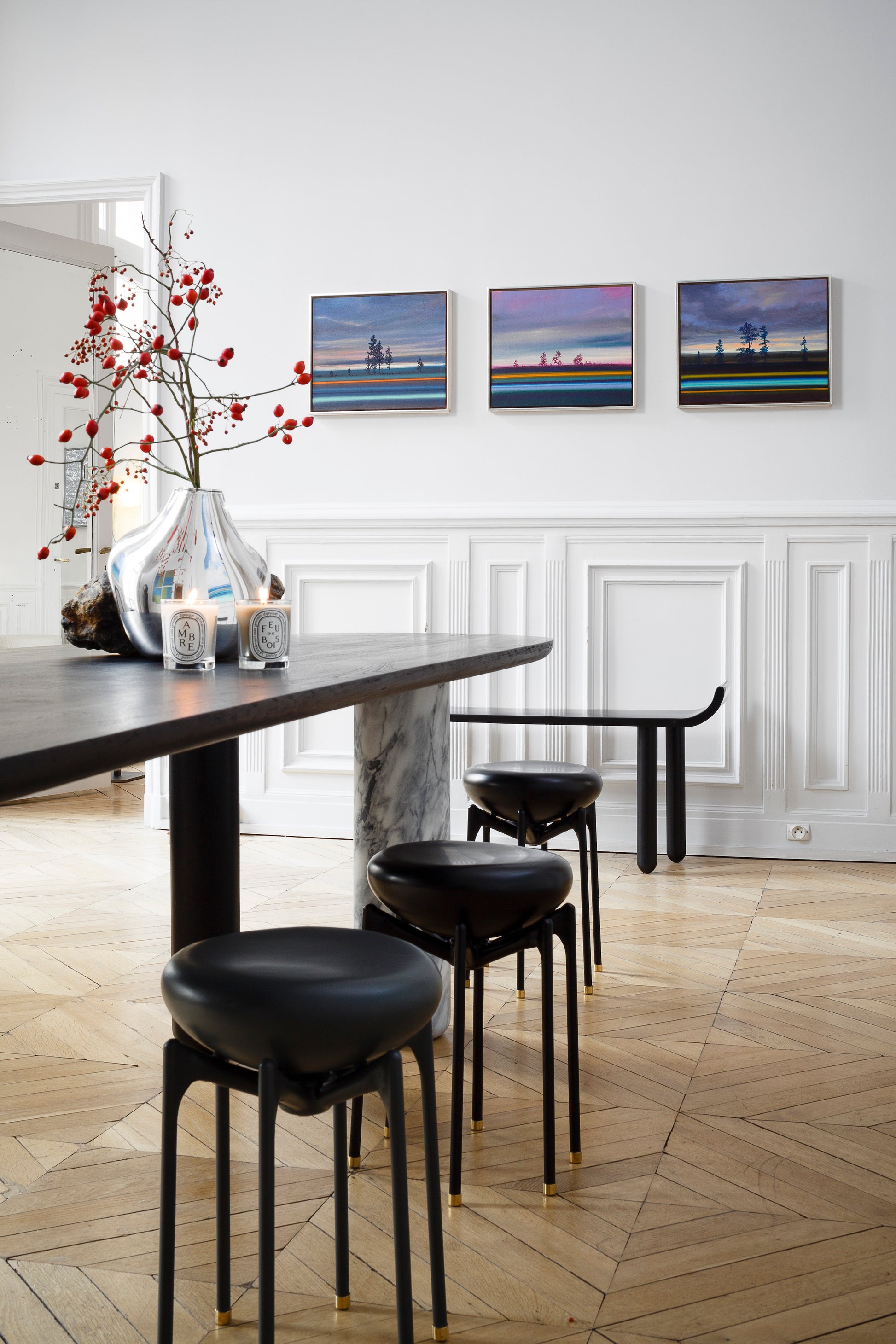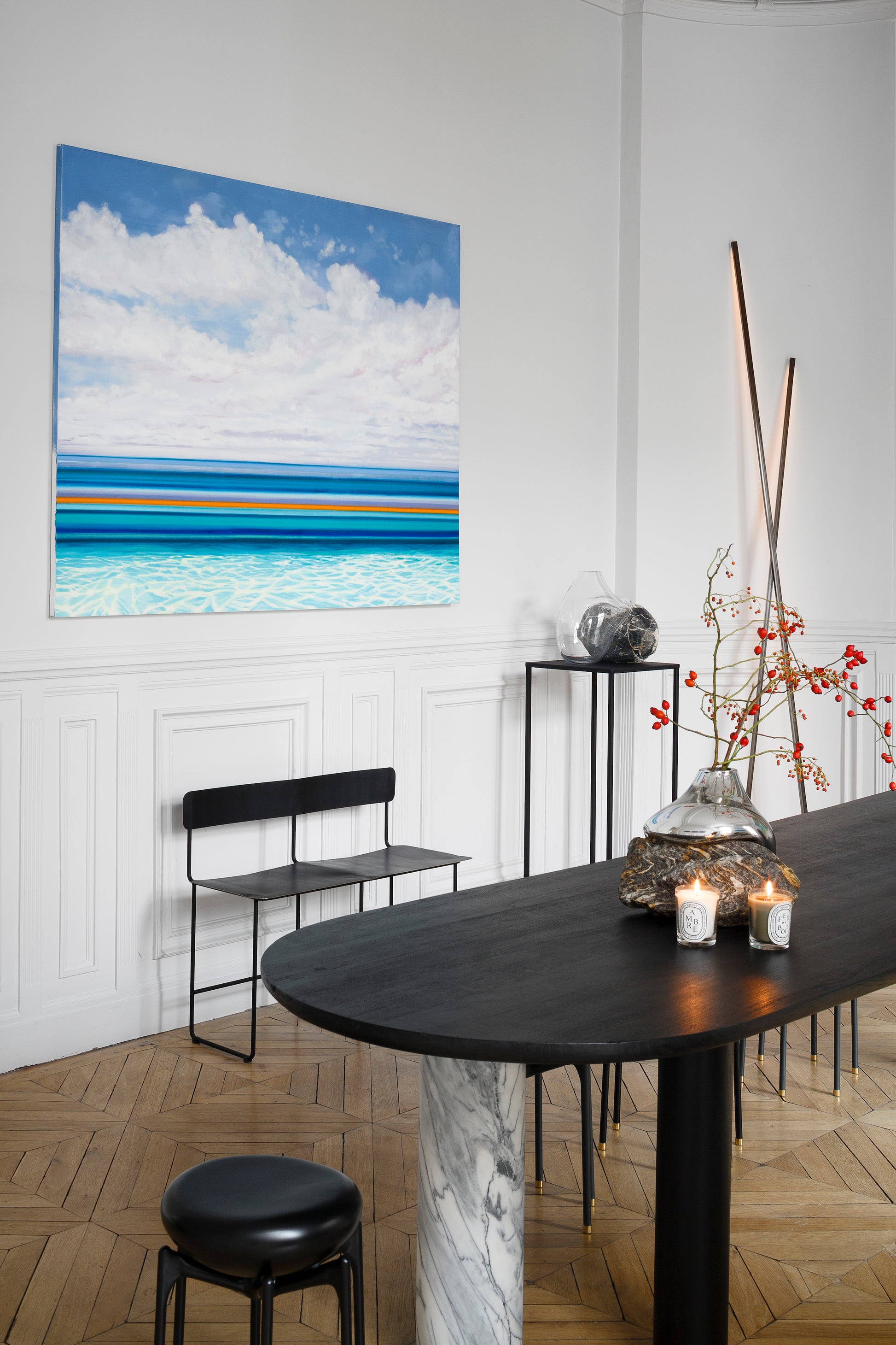 La Table Maho Stone en bois de chêne teinté arbore un majestueux pied en marbre tourné. Réinventée en exclusivité pour l'édition 2022 de l'exposition Private Choice, salon d’art et de design. Maho Stone repense notre table Maho, pièce emblématique de la collection Caroline Andréoni La Maison.