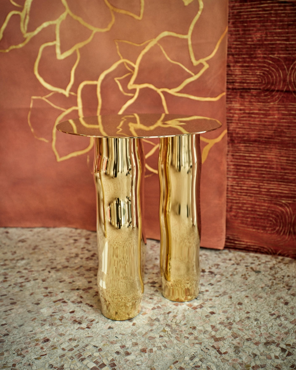 Table d’appoint en laiton poli miroir, non verni. Sa structure repose sur une intention formelle simple : trois pieds et un plateau. Ses pieds, formés de manière organique, contrastent avec la ligne fine et délicate de son plateau.