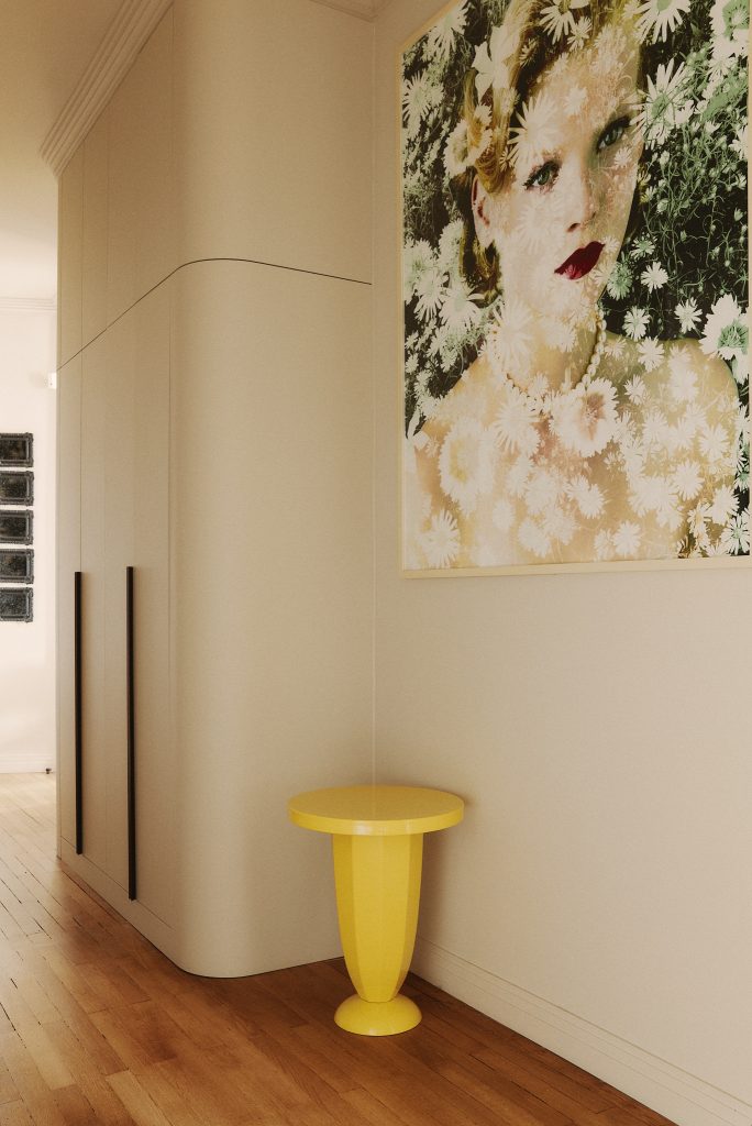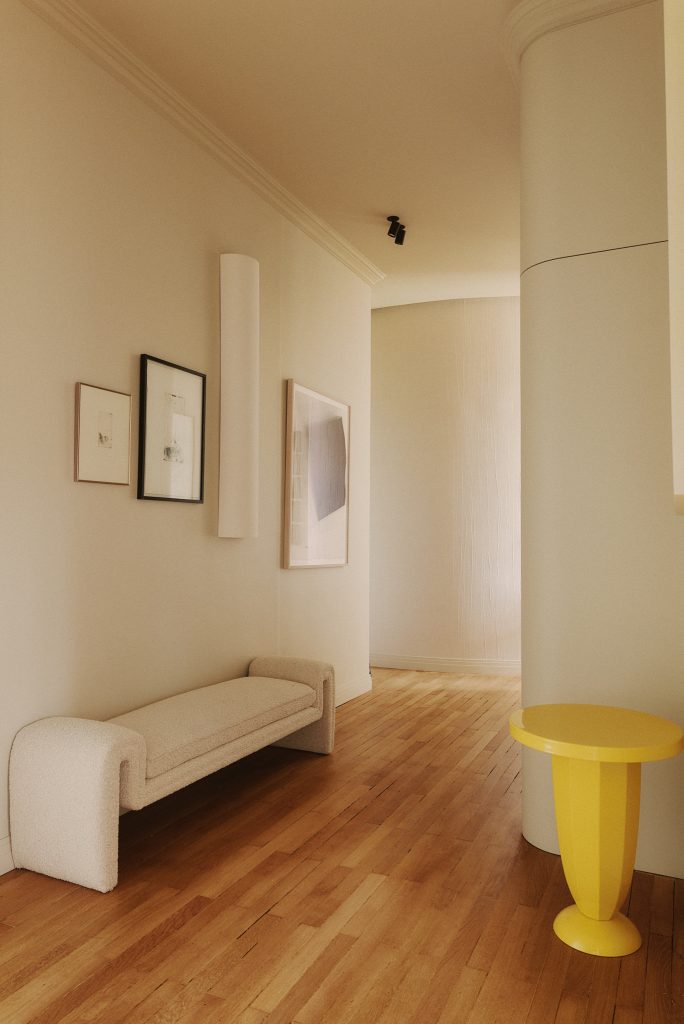 Dès l’entrée, le ton est donné. Les meubles de rangement sur mesure maximisent l’espace tout en offrant un style élégant et fonctionnel. Une banquette Bench Tondo d’Eichnoltz, provenant de Pacific Compagnie, offre un coin confortable pour se reposer. Le petit guéridon jaune emblématique de Maison Leleu apporte une touche de couleur. Les murs, peints en Shaded White par Farrow & Ball, créent une ambiance douce et accueillante.