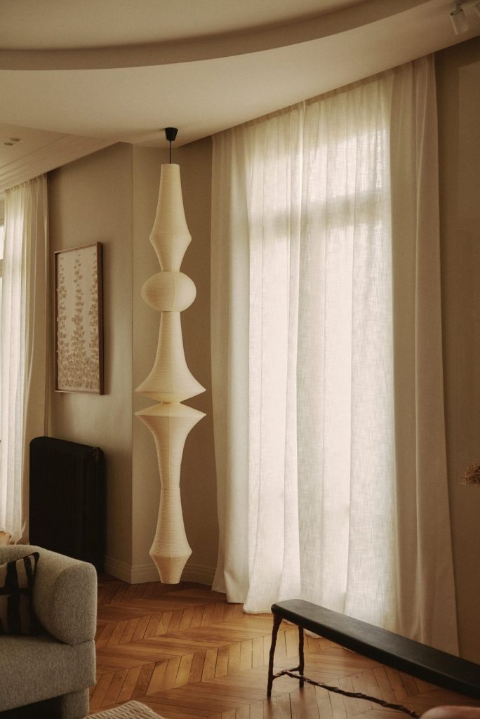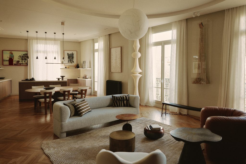 Le salon est une pièce maîtresse de l’appartement. La bibliothèque en bois de noyer est non seulement pratique mais aussi une œuvre d’art en soi. La grande suspension en papier, modèle Akari e d’Isamu Noguchi, disponible chez Nedgis, ajoute une légèreté aérienne à l’espace, et le canapé Hinoki CFOC en collaboration avec Christophe Delcourt s’intègre parfaitement à ce salon doux et luminieux. Ce mélange de textures et de matériaux crée une atmosphère chaleureuse.