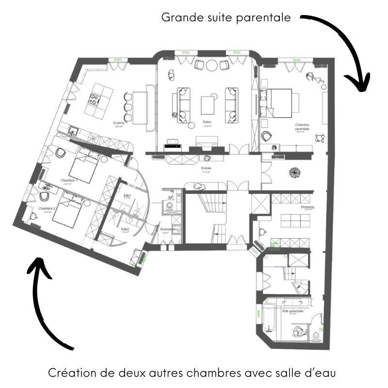 Cet appartement a été pensé pour accueillir une famille. Avec des espaces dédiés pour les enfants, chaque membre de la famille à son propre espace. L’espace parental, particulièrement grand, offre une intimité et un confort de qualité, reflétant une sensibilité artistique avec une décoration sobre mais de caractère. Un gros travail de lumière a été réalisé, notamment avec des plafonds diffusant la lumière dans la salle de bain, et des lumières en joint creux dans l’entrée.