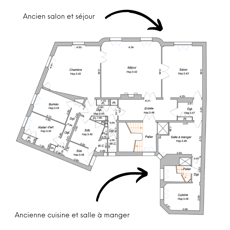 À l’origine, cet appartement parisien présentait une disposition peu pratique : la cuisine et la salle à manger étaient reléguées à de petites pièces au fond de l’appartement, tandis que le salon et le séjour se trouvaient à l’autre extrémité. Cette configuration n’était pas idéale pour accueillir des invités ou pour profiter pleinement de l’espace.
