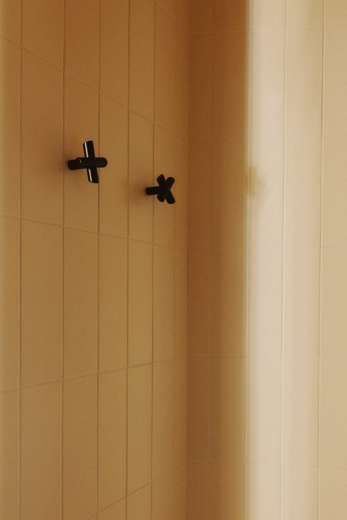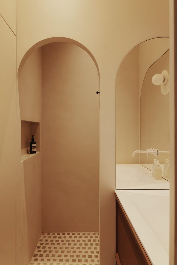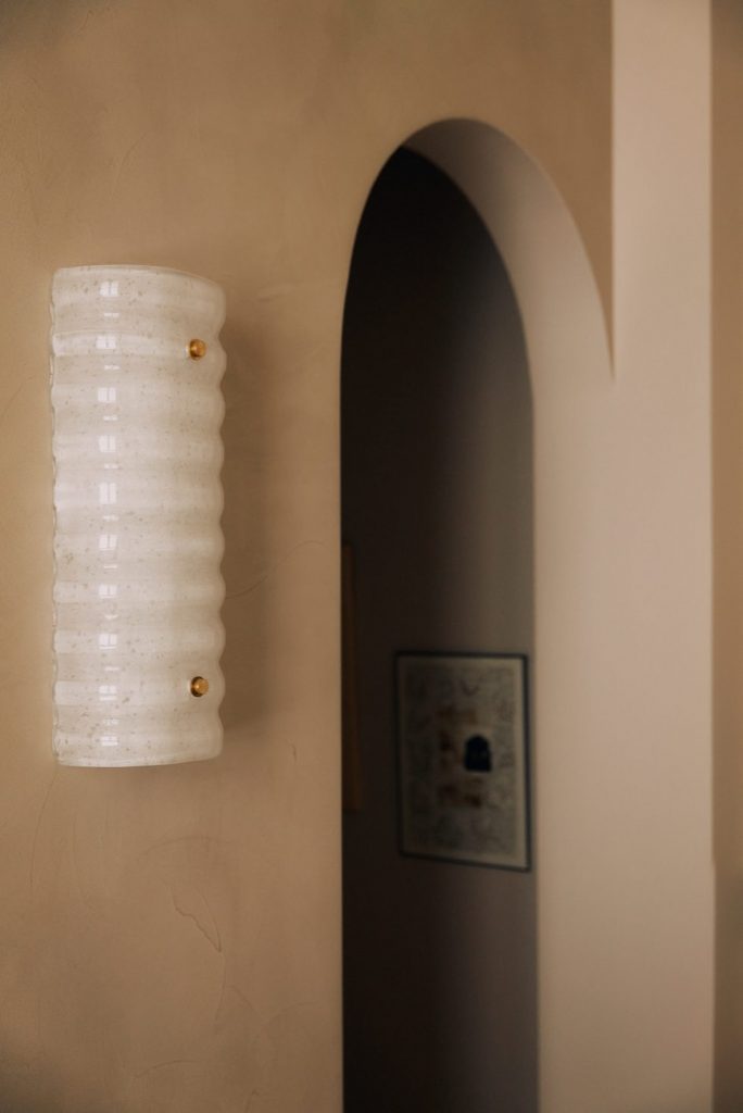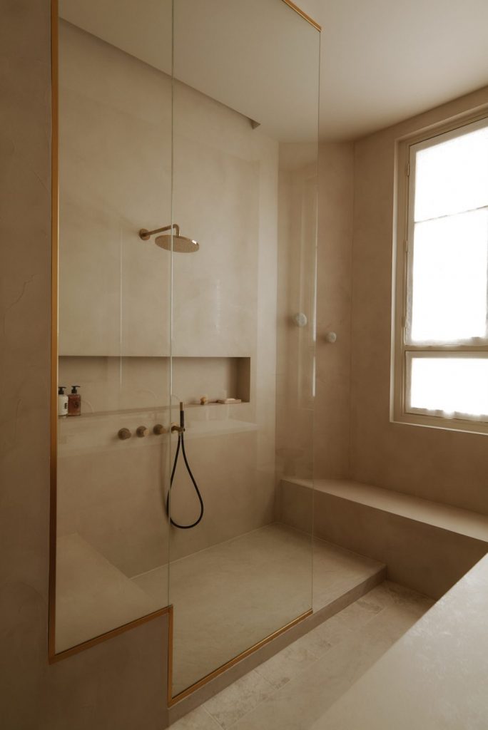 Des appliques en verre de Murano chinées apportent une touche vintage. Une niche intégrée dans la douche offre un espace pratique pour les produits de toilette. Et les patères en céramique Odo Céramique et la peinture Dune de la marque Argile ajoutent des finitions parfaites à cette pièce élégante.