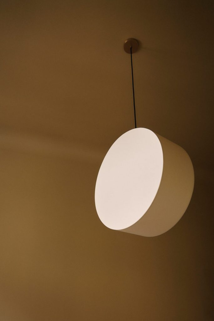 La suspension Circolo en coton blanc de Simone et Marcel diffuse une lumière douce et agréable. Les murs, peints en teinte Cord par Farrow & Ball, créent une ambiance chaleureuse et accueillante, parfaite pour un adolescent.