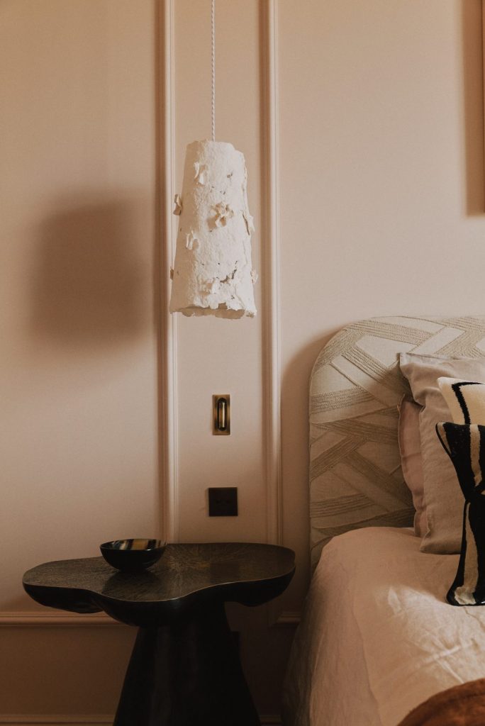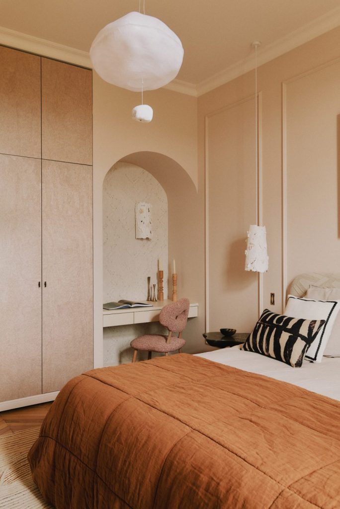 L’espace parental est un véritable sanctuaire. Le design y est chaleureux mais neutre, avec des placages en bois de noyer zébrano et d’érable pour apporter du caractère. L’entrée de la chambre parentale est marquée par un dôme rond, en écho au salon, créant une continuité visuelle harmonieuse. Nous avons souhaité faire de la suite parentale est un véritable nid douillet. La table de chevet de la Galerie Élodie Gosserez encadre le lit. La suspension centrale Nuage de Céline Wright diffuse une lumière douce et enveloppante.