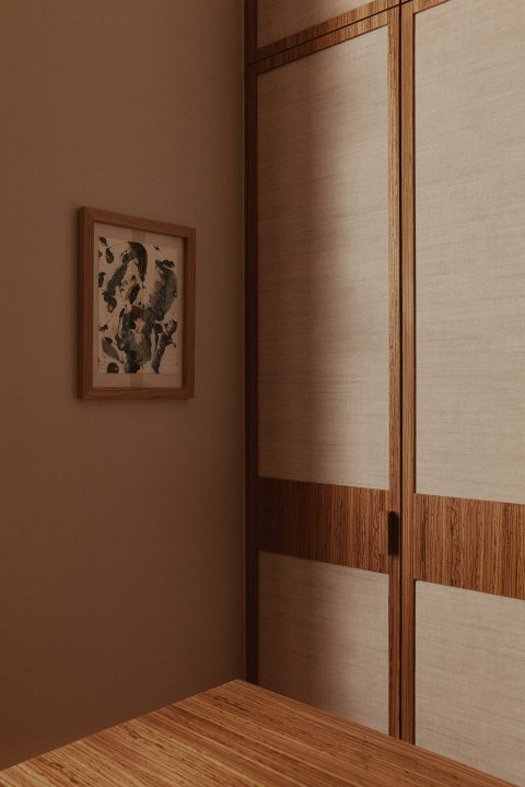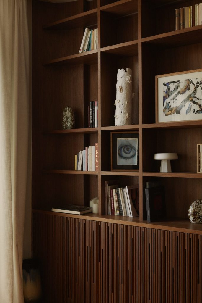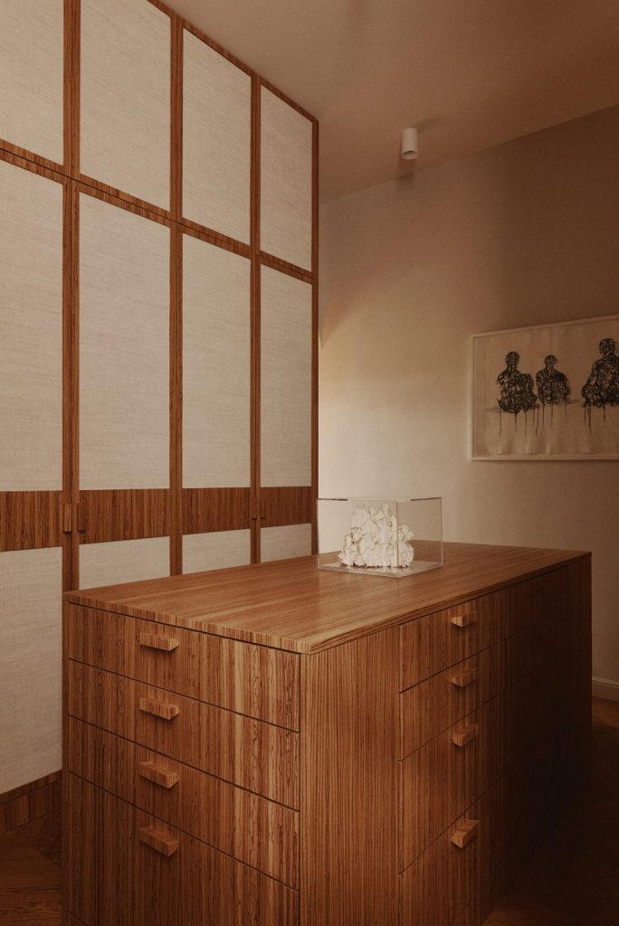 L’entrée de l’appartement est conçue comme une galerie d’art, avec des rangements pratiques et une présentation soignée des œuvres. Les portes d’origine en bois ont été conservées, tandis que les autres portes sont acoustiques pour un confort supplémentaire. Des spots orientables mettent en valeur les œuvres d’art, créant une ambiance chaleureuse et accueillante.