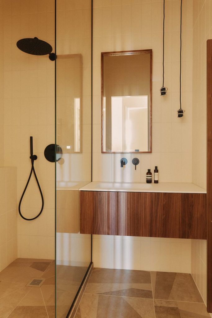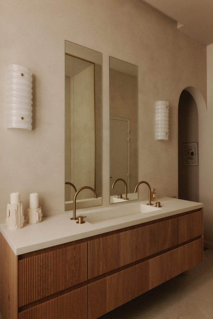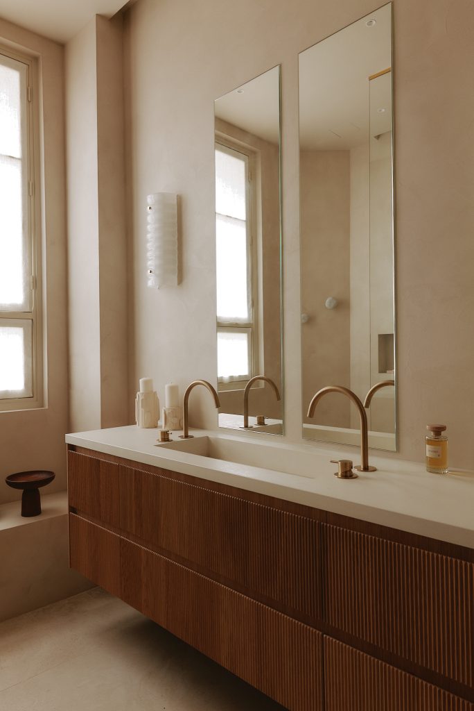 Pour la salle de bain de la fille nous avons fait le choix de la modernité et sobriété. Une applique Orbe de la marque Pierre Jade Blanche, disponible chez NV Gallery, illumine l’espace avec élégance, et le sol en grès cérame ajoute une touche d’originalité.