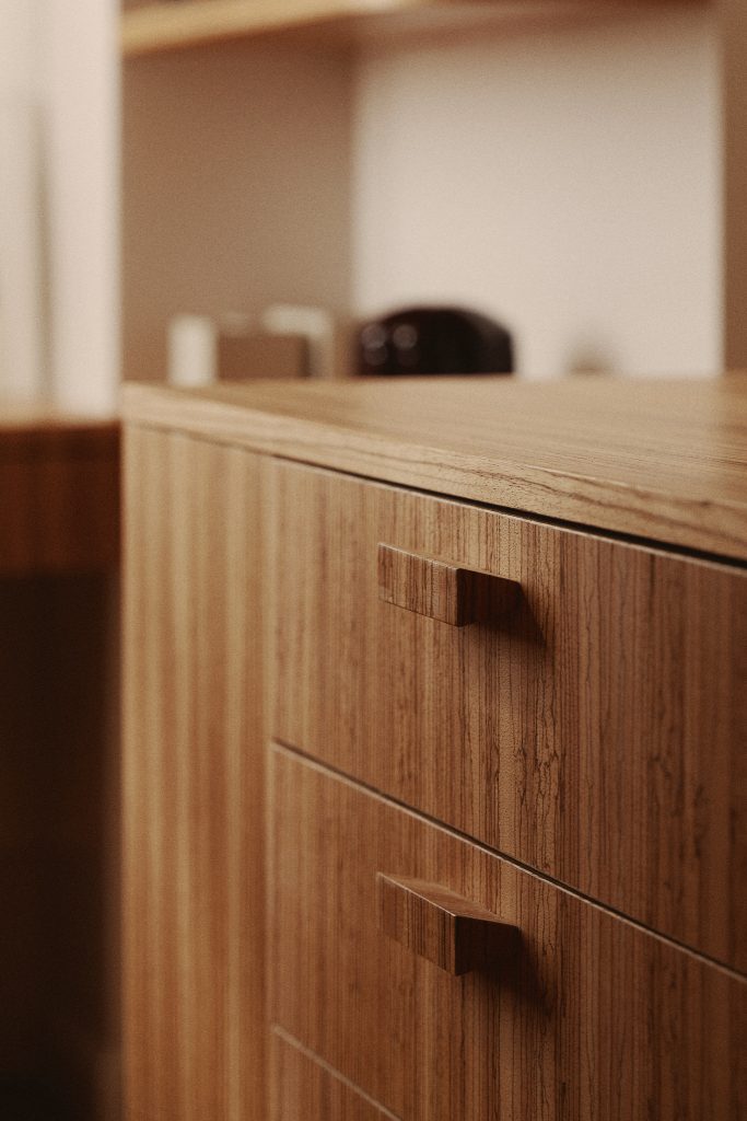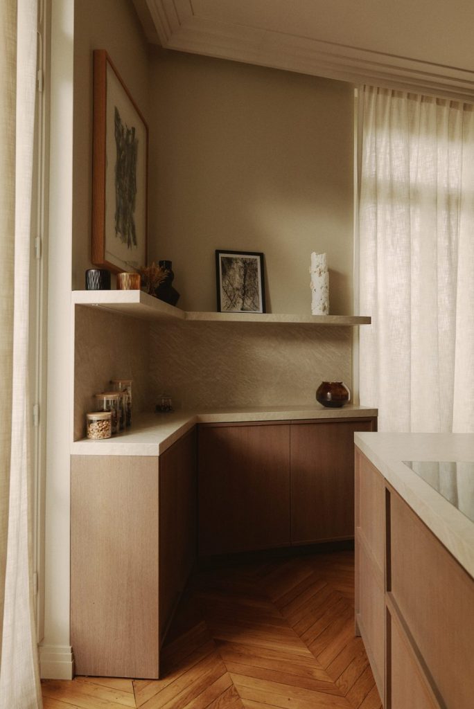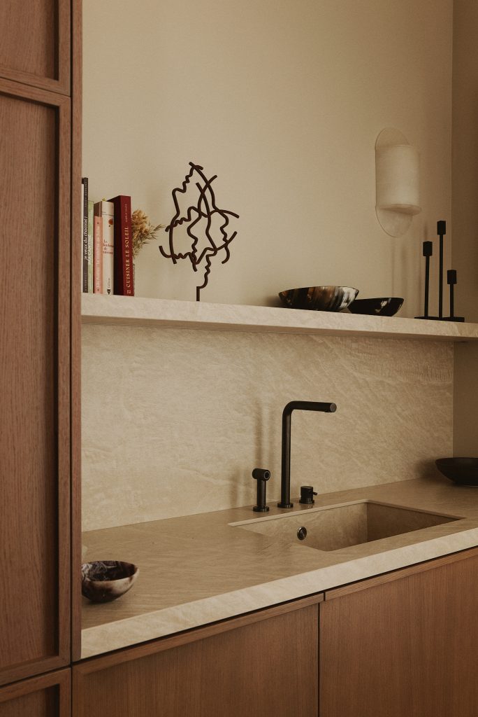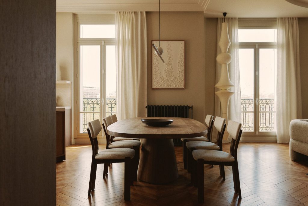 La cuisine est délimitée du salon par un travail de plafond distinctif. Le plan de travail en Dekton effet pierre est non seulement esthétique mais aussi résistant à la chaleur et aux rayures, facilitant l’entretien quotidien. La table à manger Hinoki de chez CFOC complète cet espace avec élégance.