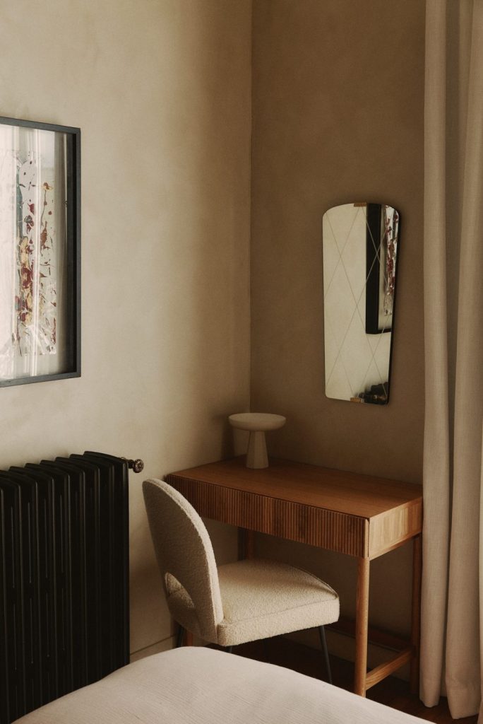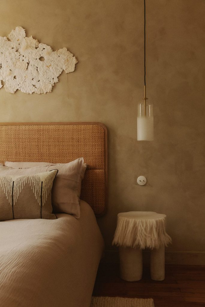 La chambre de la fille est un véritable havre de paix, avec des murs et un plafond recouverts de peinture à la chaux. Cette finition naturelle crée une atmosphère douce et apaisante, parfaite pour se détente. La chambre dispose également de sa propre salle d’eau et d’un espace bureau, assurant ainsi un cadre fonctionnel. Les teintes délicates et raffinées de la peinture à la chaux Calcaire de chez Ressource apportent une touche d’élégance subtile, tandis que le mobilier et les éléments décoratifs s’intègrent parfaitement à cette palette, transformant la pièce en un cocon accueillant et inspirant.