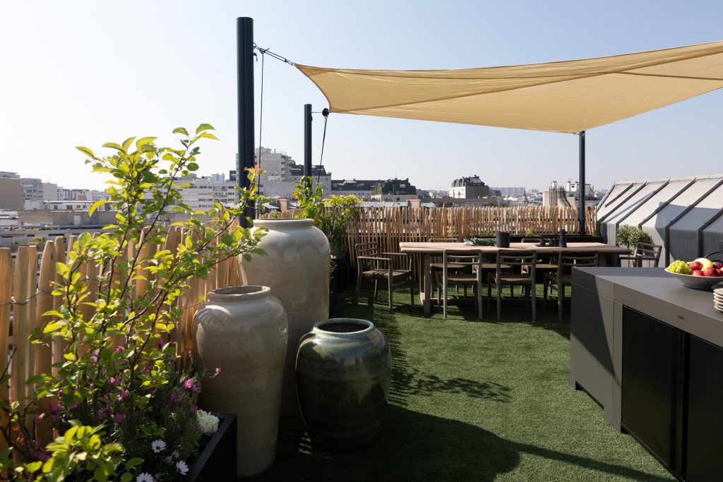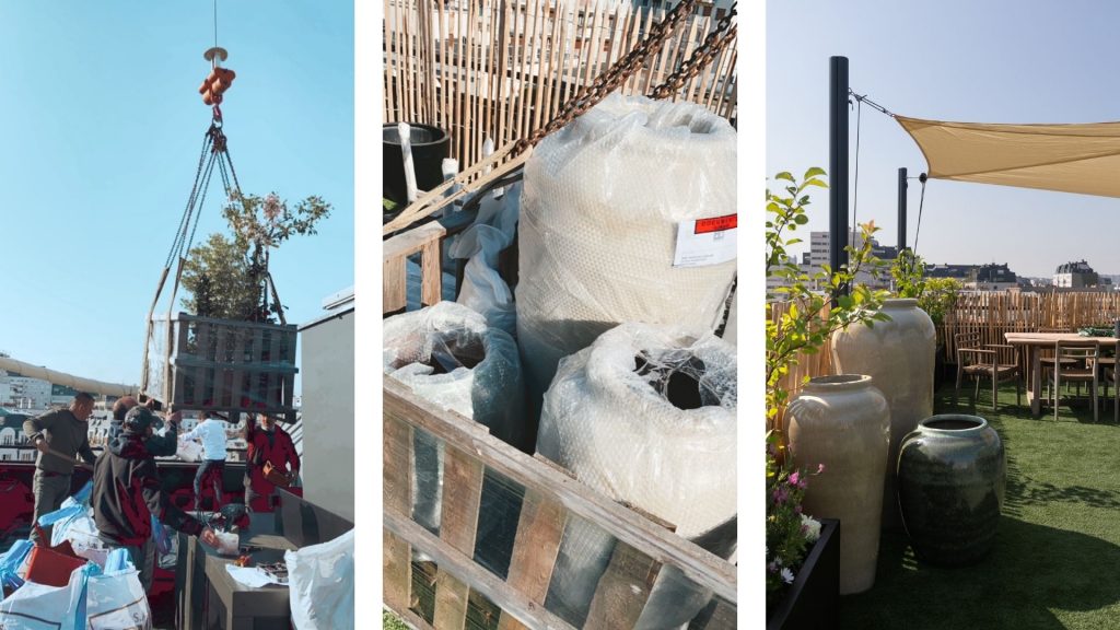 Pour la petite anecdote, nous n’avons eu qu’une demi-journée pour installer la totalité de la terrasse. Après avoir obtenu l’autorisation de la mairie pour louer la grue, c’est un véritable ballet qui a pris place pour faire déposer dans le bon ordre tous les éléments en haut de l’immeuble : la pelouse d’abord, puis la ganivelle, les bacs à plantes vides et les jarres, puis la terre pour remplir les bacs, les plantes, et enfin tout le mobilier. Une organisation millimétrée qui nous a valu quelques frayeurs !