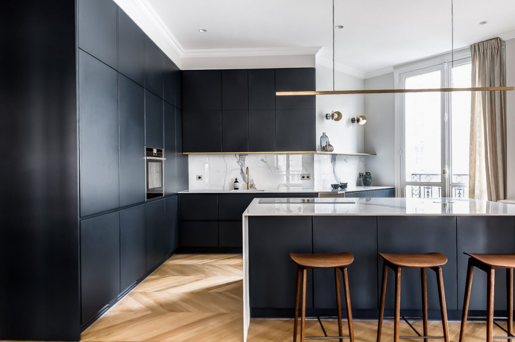 Tous les éléments anciens propres à l’Haussmannien ont bien évidemment été conservés et retravaillés pour s’adapter parfaitement aux nouveaux espaces. C’est le cas par exemple des moulures dans la cuisine qui viennent épouser le contour des meubles hauts ou du parquet en point de Hongrie qui a été déposé pour une isolation totale du sol.