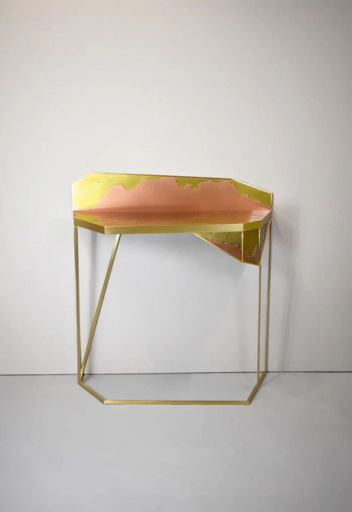 Entièrement réalisée en cuivre et laiton, la console Erosion fait un parallèle intéressant avec la transformation de l’écorce terrestre au fil du temps. Cette pièce réalisée par l’Atelier Demichelis porte ainsi son nom de cette usure que nous retrouvons sur le contraste entre les deux couleurs.
