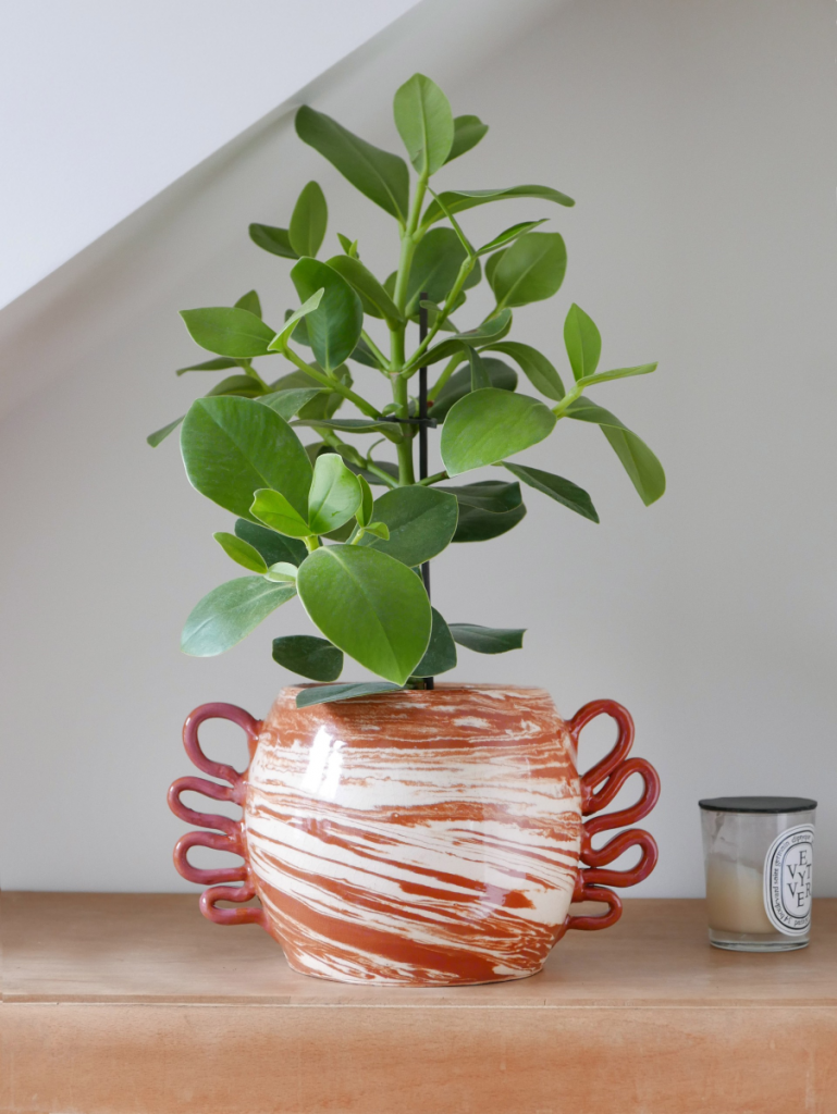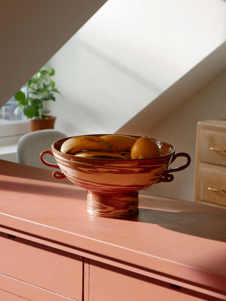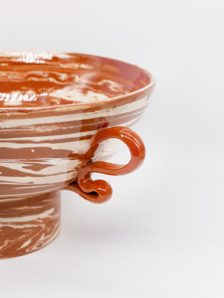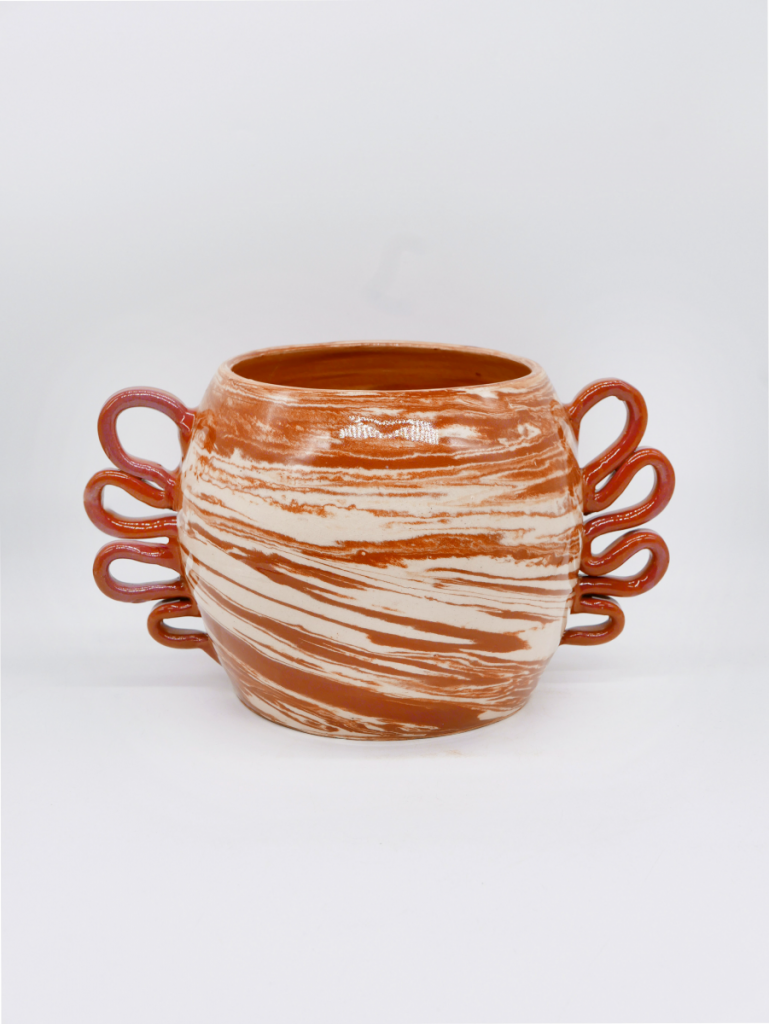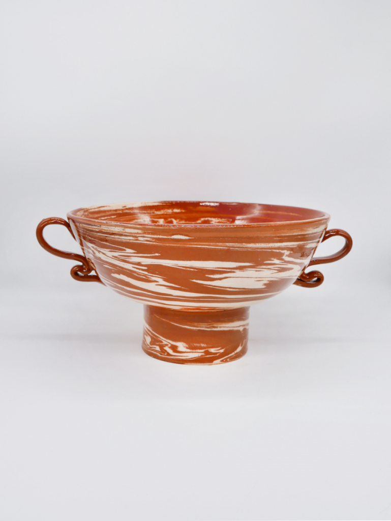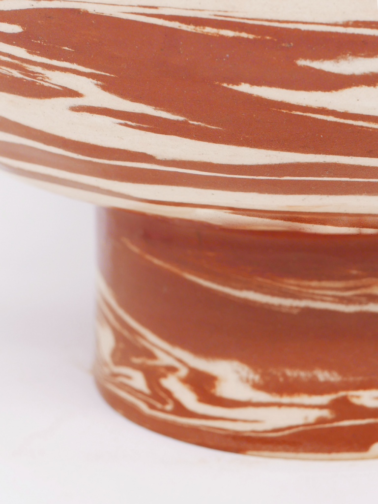 L’ensemble des pièces de la collection sont tournées une par une à la main en utilisant la technique des terres mêlées. Il s’agit de mélanger des argiles blanches et rouges afin de créer des motifs aléatoires marbrés ou zébrés dans des teintes naturelles terracotta. Chacun de ces objets est ainsi totalement unique. Ils sont le témoin de gestes transmis de génération en génération et du temps passé à confectionner chacune de ces poteries.