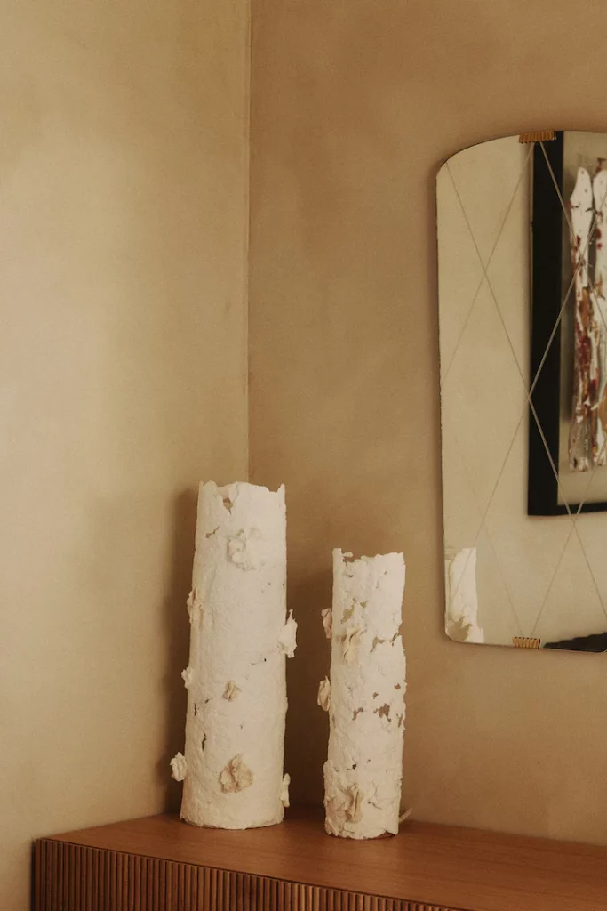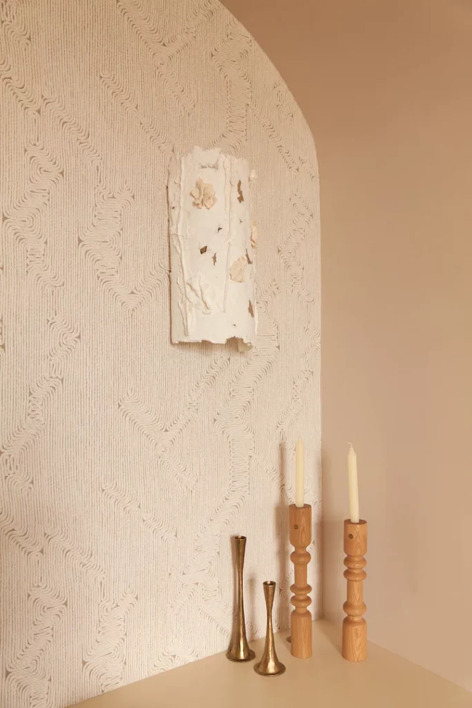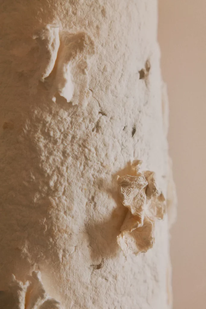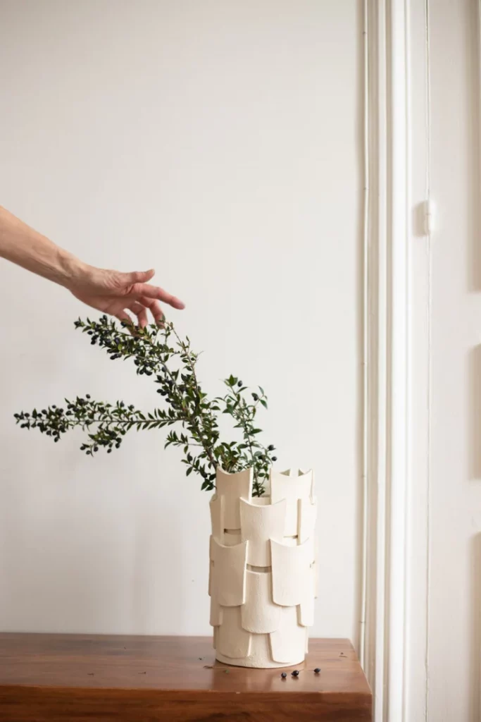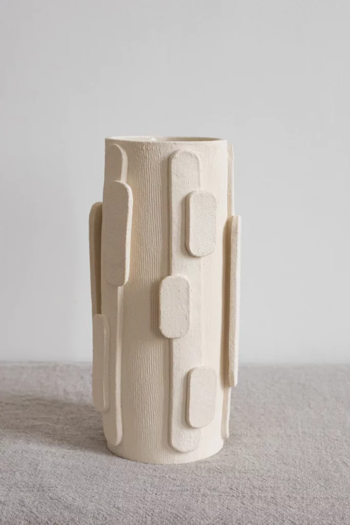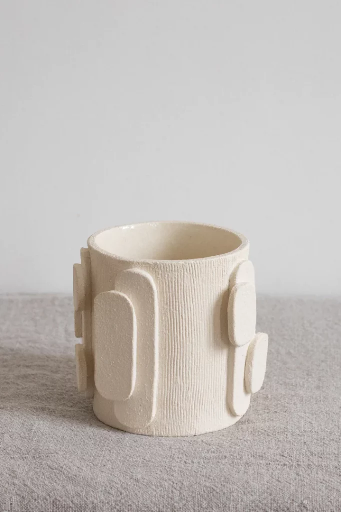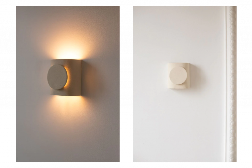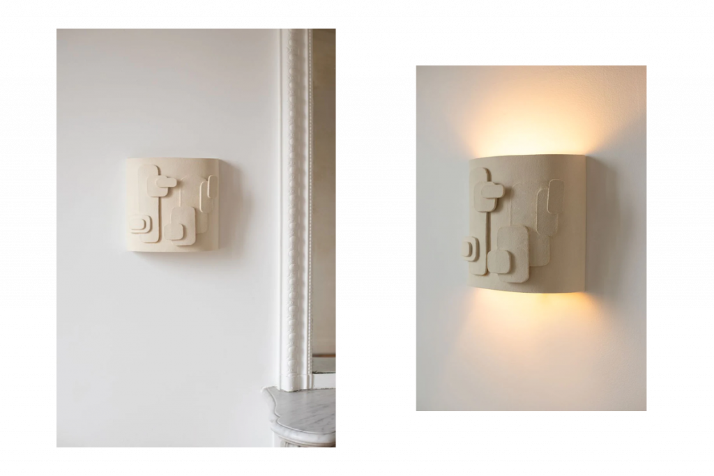 L’applique Cactus, inspirée des esquisses de la créatrice Adeline Delesalle, joue sur des formes en relief reprenant des représentations abstraites de cactus. Alliant sa profondeur à un jeu d’ombre et de lumière, l’applique est fabriquée avec du grès blanc chamotté, terre lisse à laquelle a été rajoutée de la terre cuite broyée, lui donnant une texture idéale pour le modelage et un grain authentique.