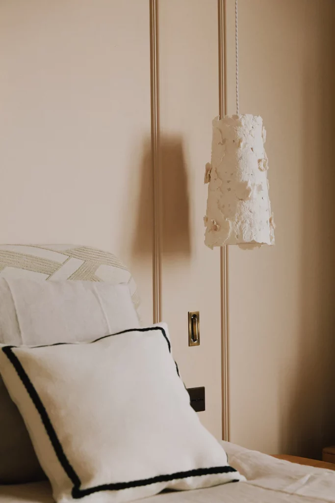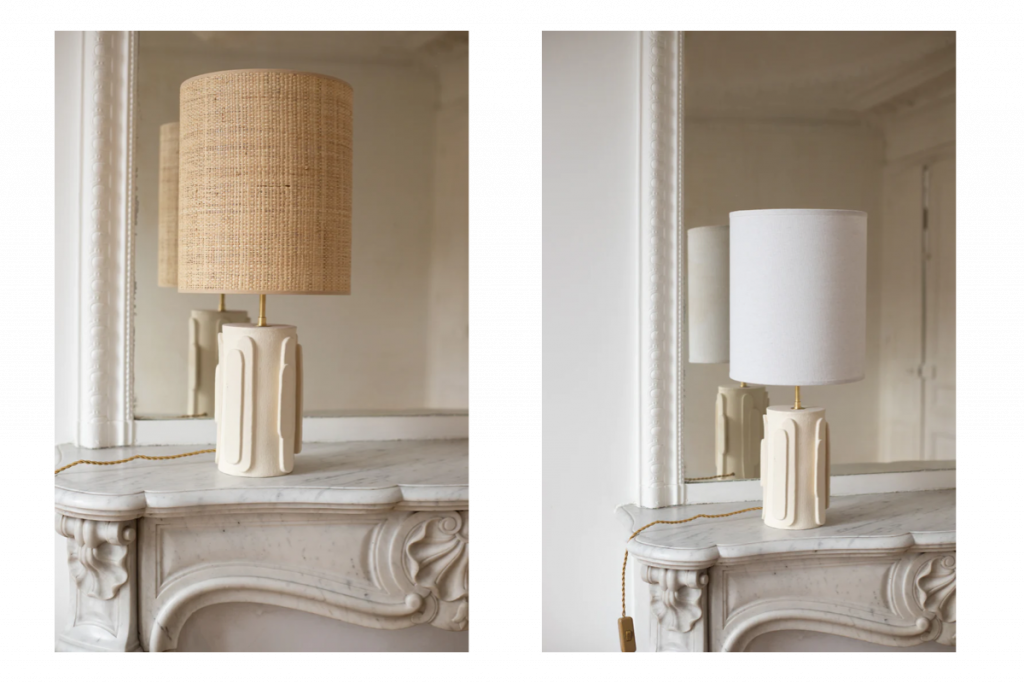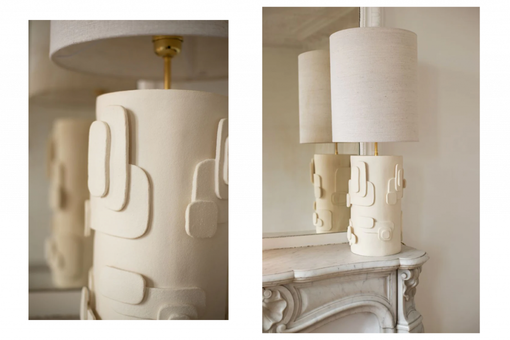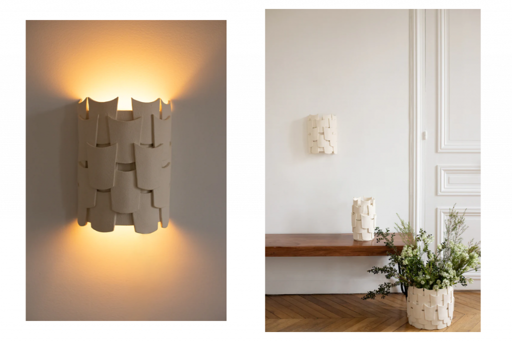 La collection réalisée selon la technique de la plaque offre plusieurs sorties de lumière. Signifiant petit soleil en arabe, Tini Chams est fabriquée avec du grès blanc chamotté, terre lisse à laquelle a été rajoutée de la terre cuite broyée lui donnant une texture idéale pour le modelage et un grain authentique.