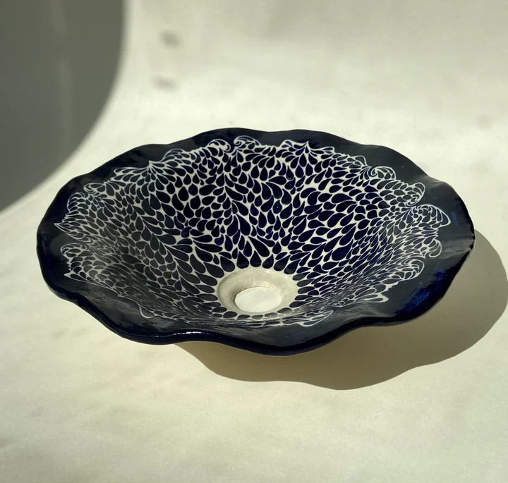 La vasque à poser Acqua réalisée par l’artiste Thalia Dalecky en exclusivité pour Caroline Andréoni La Maison est confectionnée avec du grès chamotté de couleur crème. Cette pièce artisanale, peinte minutieusement à la main en bleu nuit, incarne une élégance raffinée en associant la profondeur du bleu à des accents de crème.