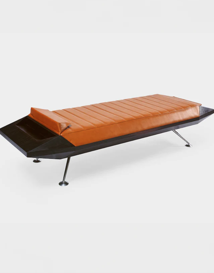Plus qu’une méridienne, c’est un vaisseau en lévitation. La Méridienne Esprit est réalisée en bois plaqué Ebène de Macassar avec une sellerie en cuir pleine fleur et le piètement en acier taillé dans la masse.