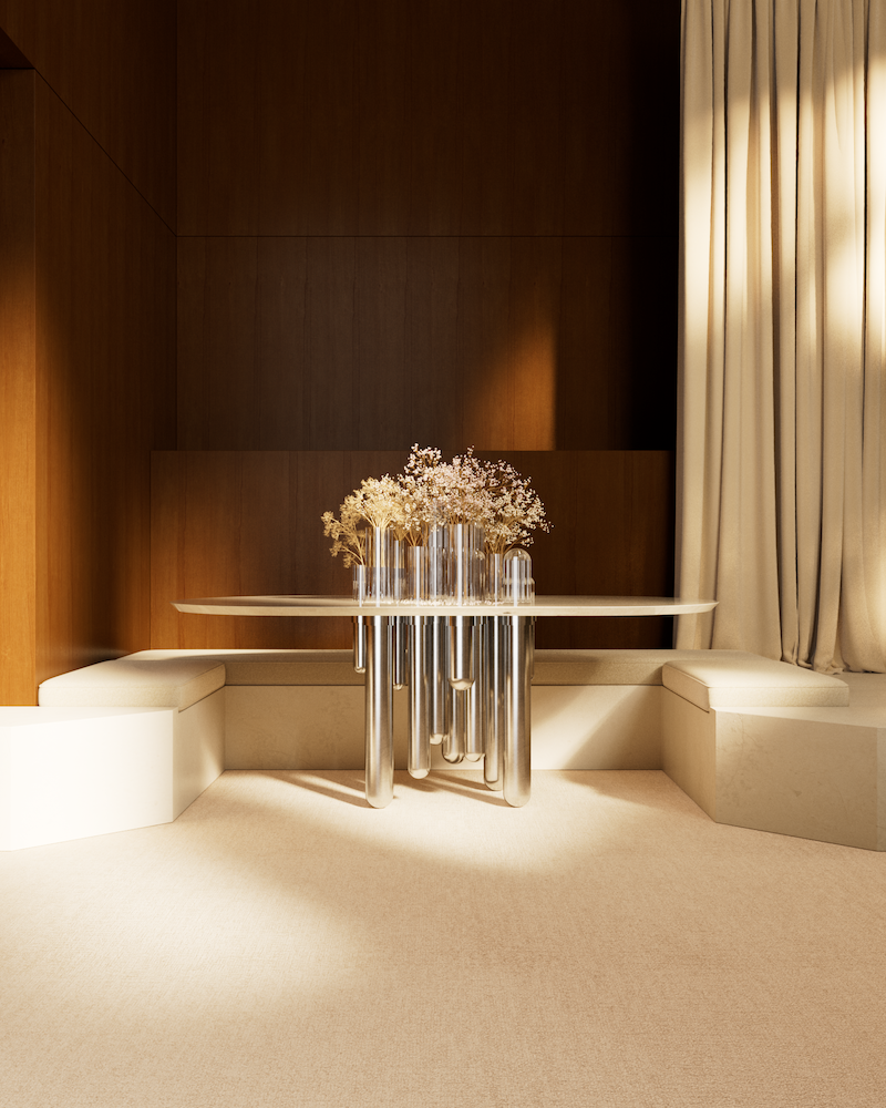 Une recette onirique prenant ses racines dans l’excentricité du mouvement Memphis. Cet univers vitaminé et sans limites dans l’exploration de techniques inédites s’inscrit dans un circuit court de création préservant ainsi les savoir-faire français.
