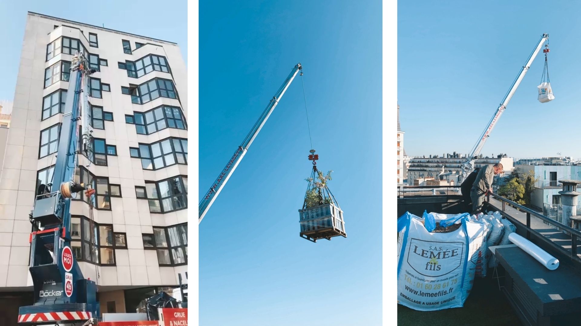 Pour la petite anecdote, nous n’avons eu qu’une demi-journée pour installer la totalité de la terrasse. Après avoir obtenu l’autorisation de la mairie pour louer la grue, c’est un véritable ballet qui a pris place pour faire déposer dans le bon ordre tous les éléments en haut de l’immeuble : la pelouse d’abord, puis la ganivelle, les bacs à plantes vides et les jarres, puis la terre pour remplir les bacs, les plantes, et enfin tout le mobilier. Une organisation millimétrée qui nous a valu quelques frayeurs !