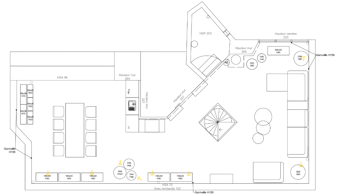 Sur la partie gauche, la terrasse est désormais composée d’une cuisine extérieure et d’un coin repas et travail. Nous avons intégré des prises au sol au niveau de la table, ramené le wifi et sonorisé l’espace grâce à des enceintes extérieures pour en faire un vrai lieu de travail et d’échange. Il était aussi indispensable de prévoir une zone d’ombrage. Nous avons opté pour une voile enroulable (de chez Espace Ombrage) fixée à des mats par 2 points d’attache , un système d’usage très facile pour installer la voile, la ranger et pour bien la maintenir en cas de vent violent.