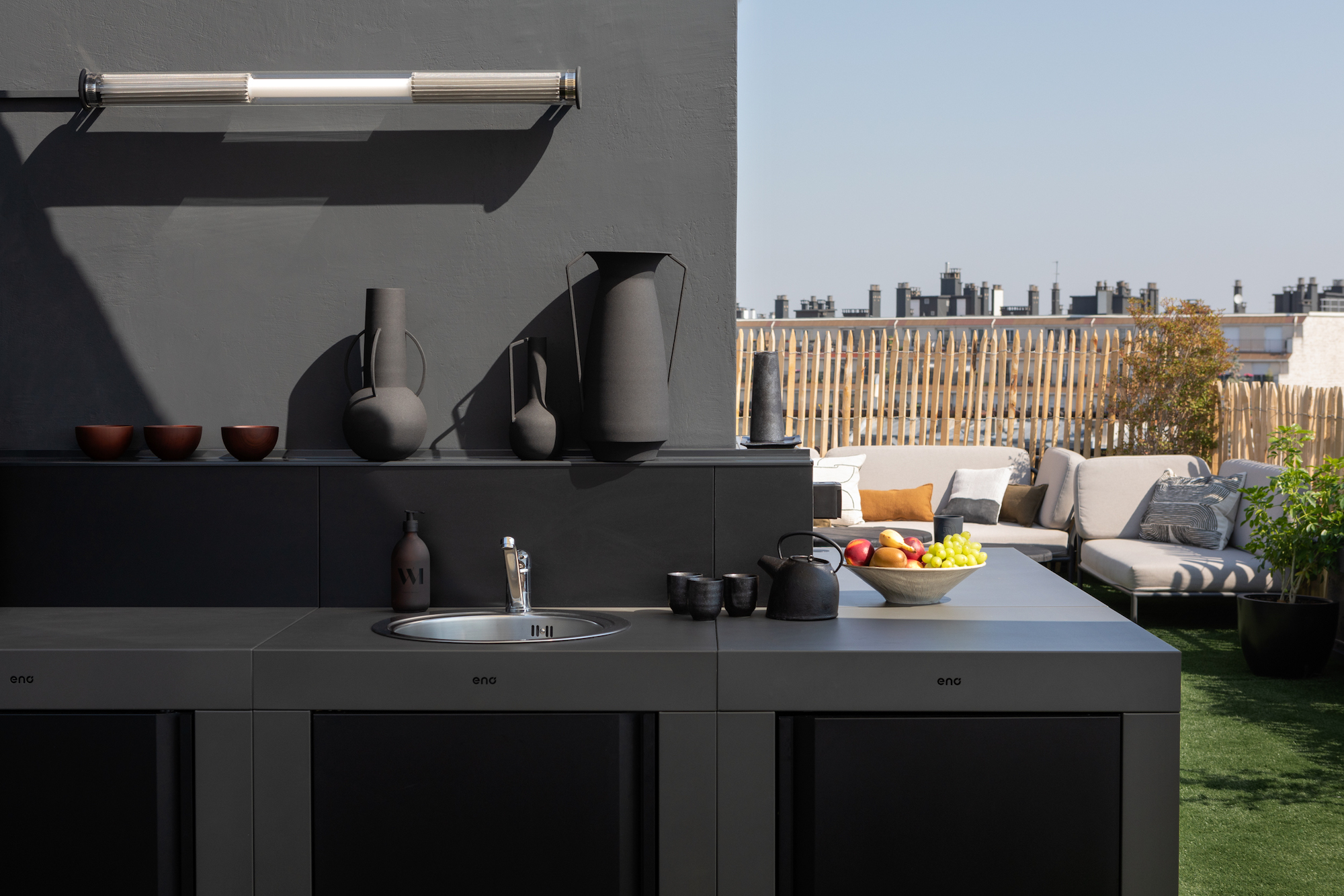 L’idée du projet a été de valoriser cet espace extérieur en le traitant comme une vraie pièce supplémentaire à l’appartement. Nous avons voulu en faire à la fois un espace de travail mais aussi un espace de vie avec une cuisine équipée et un coin repos. On vous montre !