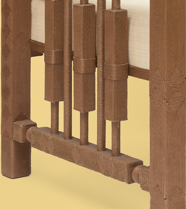 Ce fauteuil s’inspire des chaises de mariage punjabi utilisées comme trônes lors des célébrations en Inde et au Pakistan, et réinterprète ce symbole d’opulence avec un travail du bois détaillé et une attention particulière au travail de la laque qui recouvre l’ensemble de la pièce. Cette version exceptionnelle a une structure entièrement recouverte de corde.