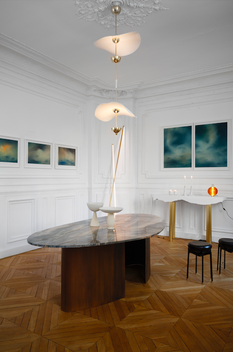 Ce qu’on a aimé : la sublime table en granit du Brésil d’Alain Daudré avec ses formes organiques (photo), les tables basses en noyer et résine d’Uchronia ainsi que la technique de Kintsugi pratiquée par Myriam Greff sur ses céramiques.