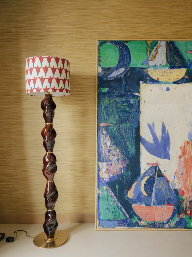 L’abat-jour orné de tulipes apporte une touche organique et délicate, qui équilibre la force de la base.
