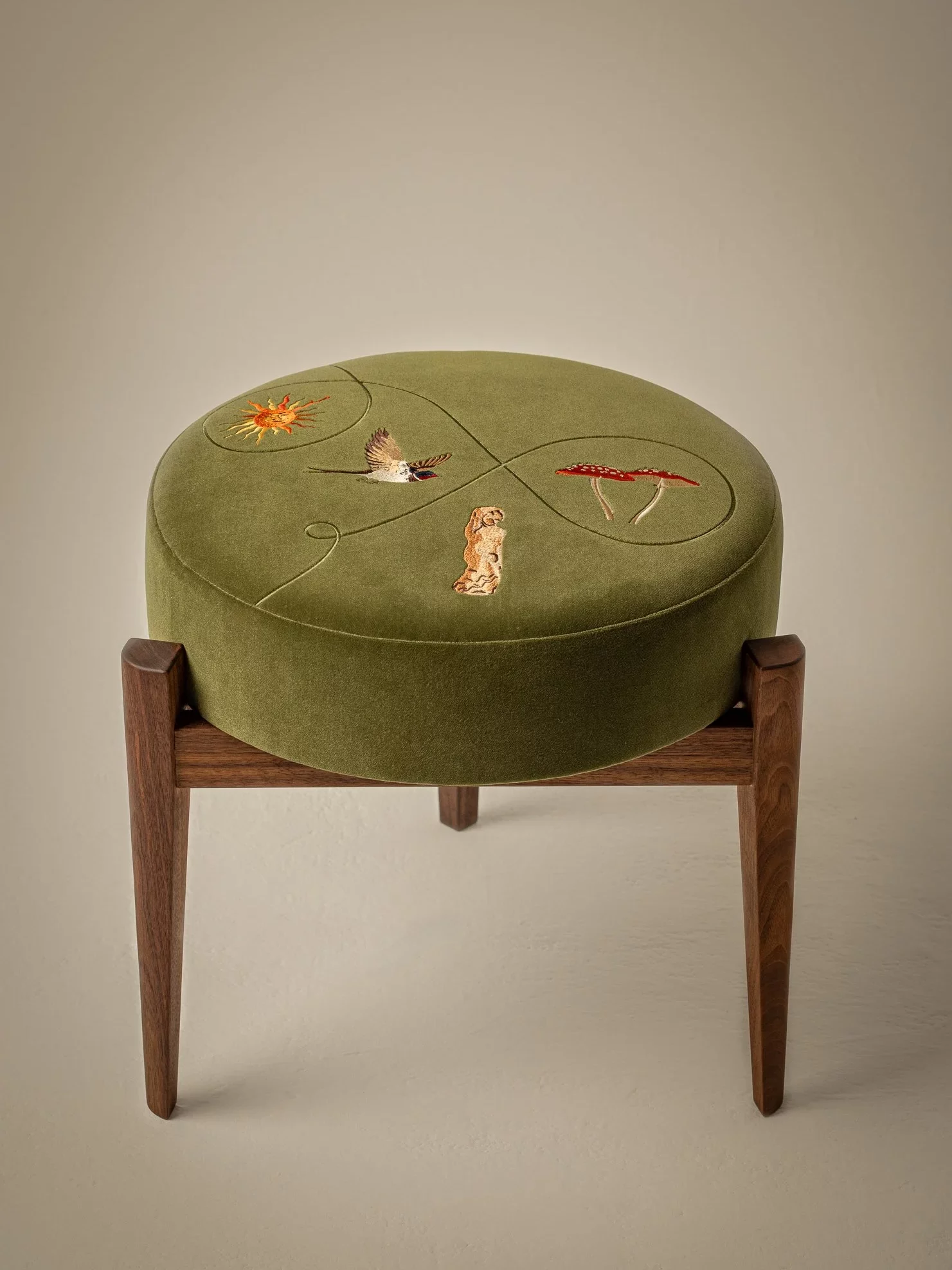 Quatre motifs brodés et une ligne centrale racontent une histoire personnelle, intime, dans un langage visuel inspiré de l’iconographie ancienne et du quotidien. Les pieds fuselés, la chaleur du bois et la richesse textile en font un objet à la fois pratique, confortable et sensible.