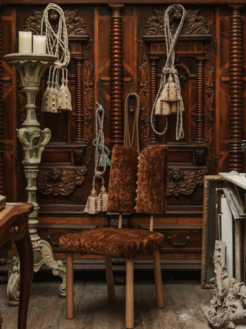 Pensé comme une pièce à mi-chemin entre mobilier et objet de transmission, il allie velours brodé couleur genévrier et structure en noyer massif aux lignes classiques et épurées.
