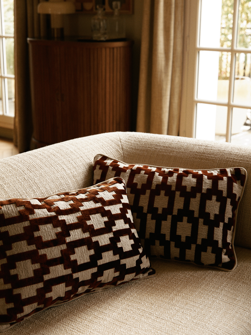 Apportez une touche d’élégance à votre intérieur avec le coussin Damier Prestige, par son design distinctif et le mariage harmonieux de tons marron et beige, sublimé par des motifs géométriques audacieux qui captent le regard tout en restant intemporels. Le rendu parfait pour rehausser la décoration de tout espace de vie. Sublimé par un passepoil en velours beige délicatement cousu, apportant une touche de raffinement et d’élégance discrète, le Damier Prestige est idéal pour enrichir l’atmosphère de votre salon, chambre ou bureau.