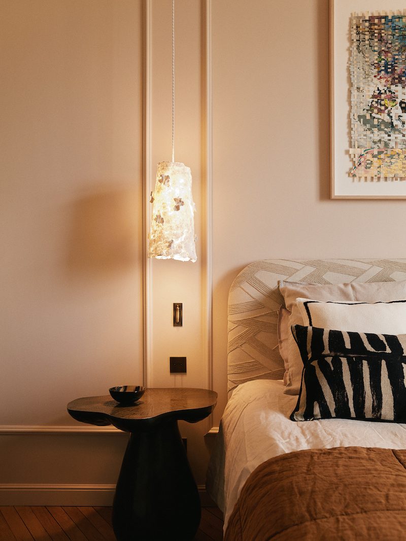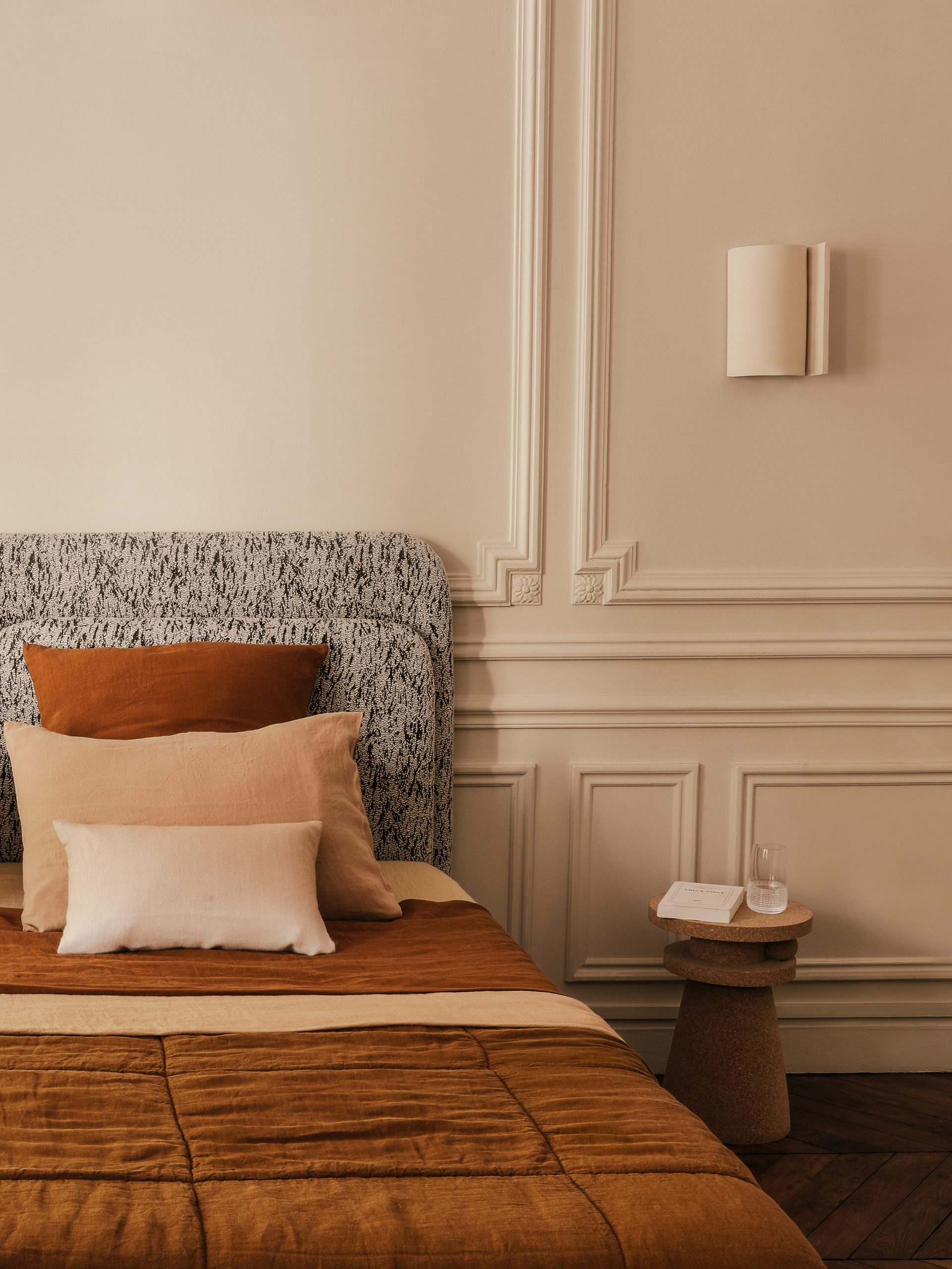 La créatrice Caroline Andréoni a dessiné l’applique Kara avec l’envie de créer une lampe murale à la lumière chaude et douce. C’est en se promenant en Italie, chez un éditeur de tissus de luxe, qu’elle a eu un coup de cœur pour ce motif graphique original. Il fait directement écho au voyage et à la longue route que nous avons choisi d’emprunter en lançant la marque Caroline Andréoni La Maison.
