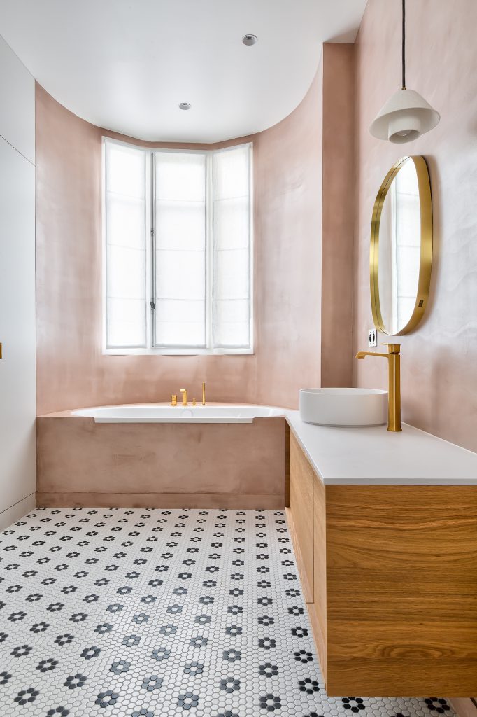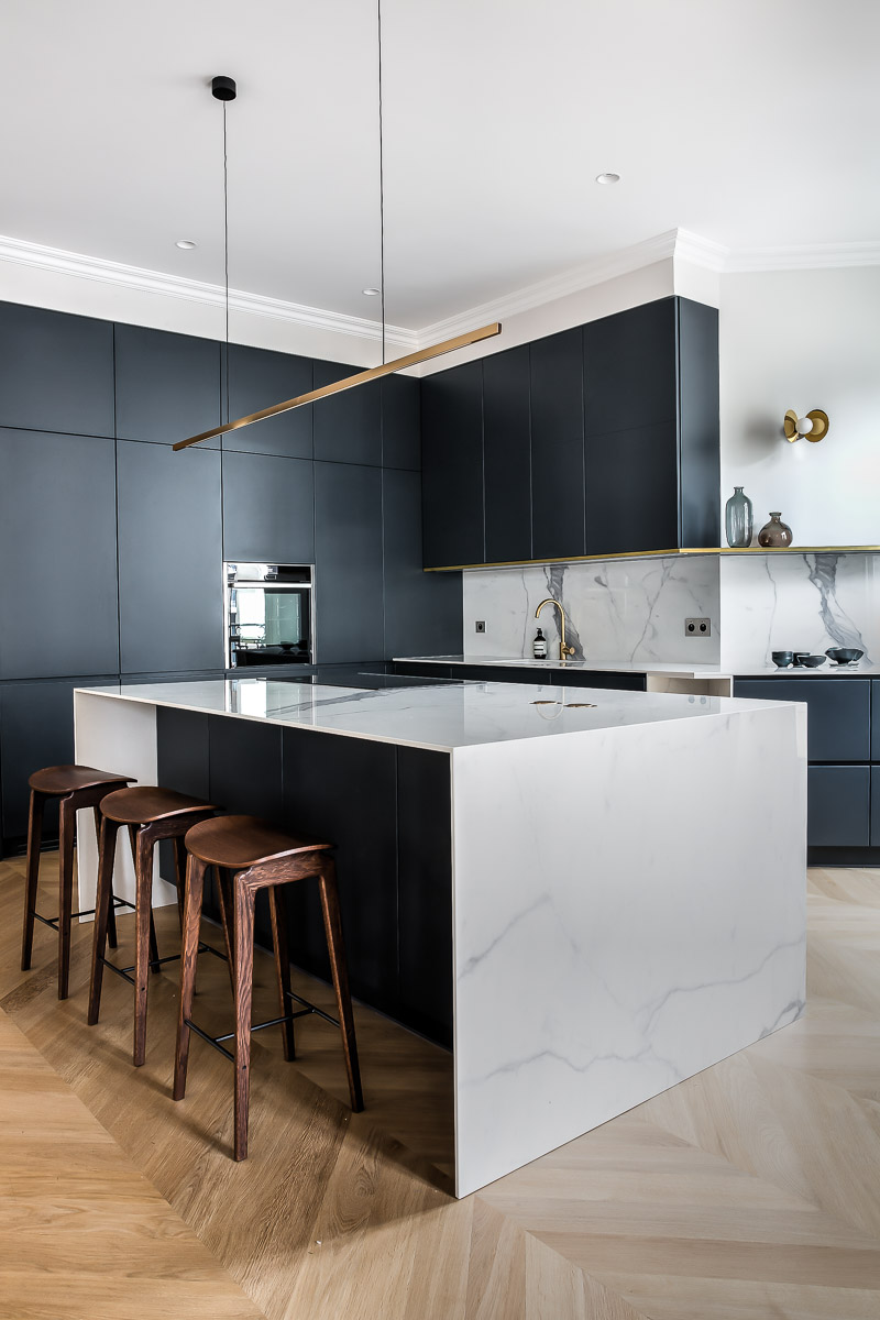 Tous les éléments anciens propres à l’Haussmannien ont bien évidemment été conservés et retravaillés pour s’adapter parfaitement aux nouveaux espaces. C’est le cas par exemple des moulures dans la cuisine qui viennent épouser le contour des meubles hauts ou du parquet en point de Hongrie qui a été déposé pour une isolation totale du sol.