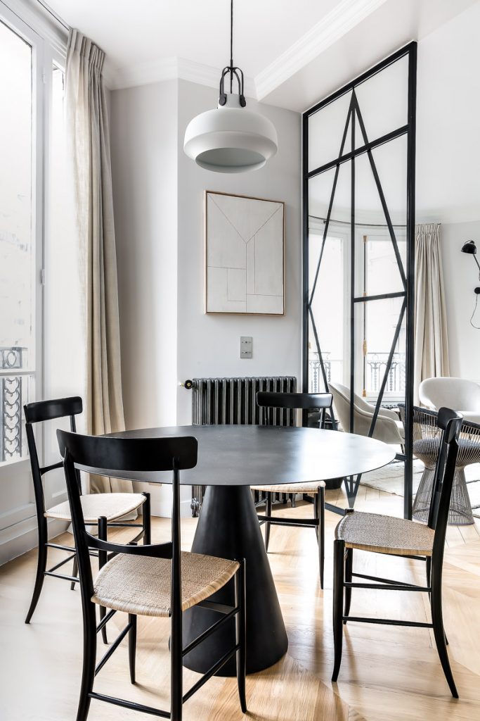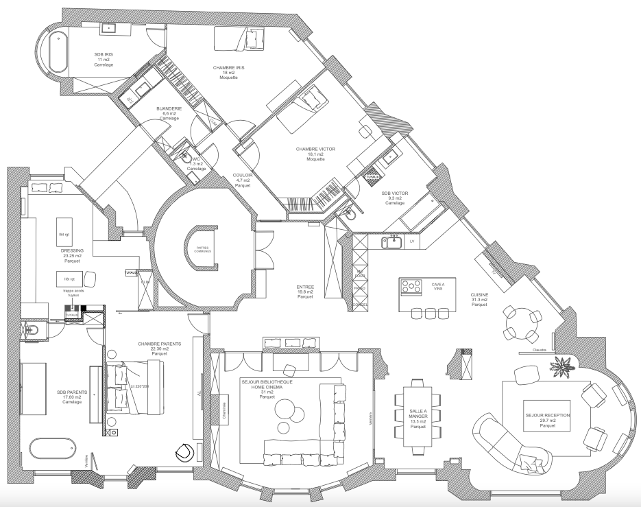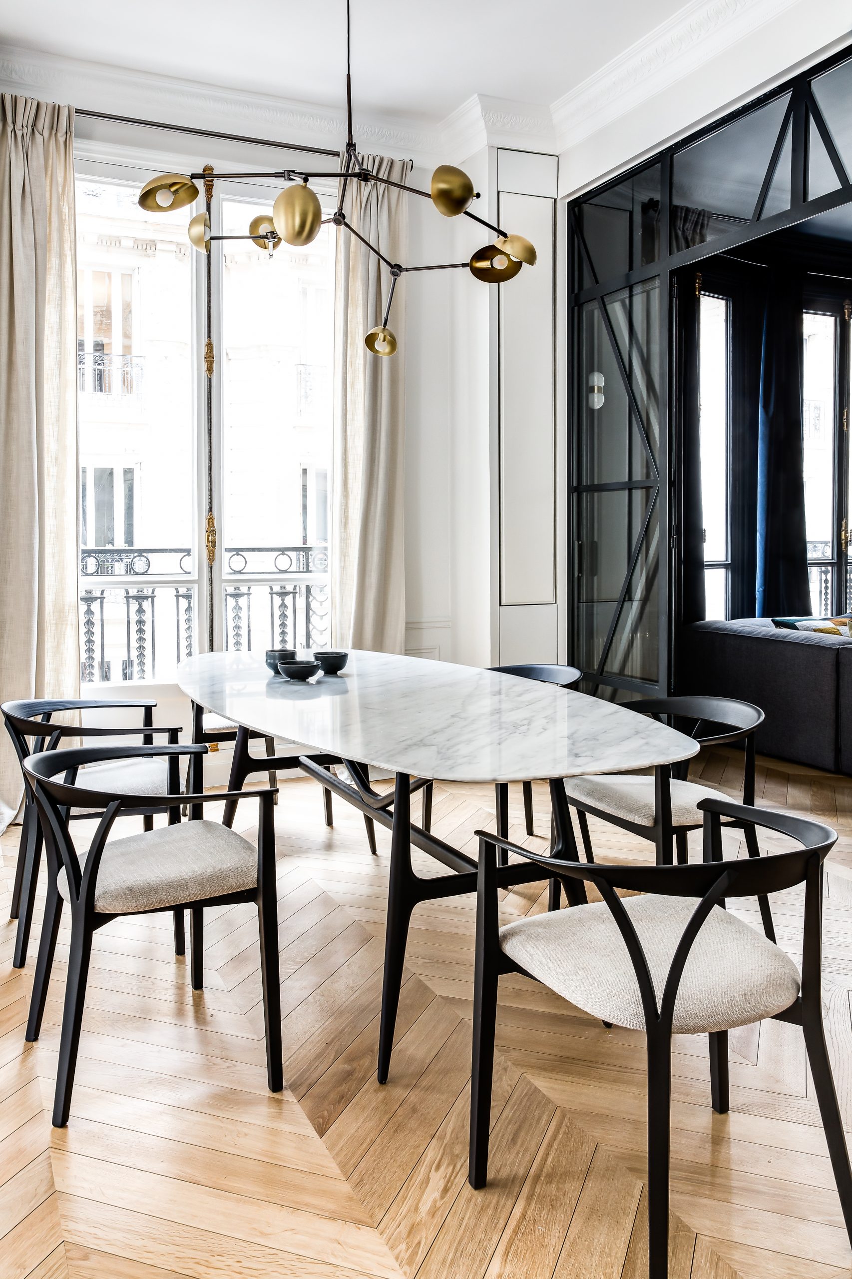 Pour les espaces de réception, nos clients souhaitaient avoir un seul et même espace ouvert sur la cuisine où ils passent beaucoup de temps. Nous avons donc abattu toutes les cloisons pour ne créer qu’un seul et même espace de 95m2 accueillant une grande entrée, une cuisine ouverte avec son coin repas, une salle à manger et un grand espace de réception. Nous avons opté pour un style clair et lumineux, plein de contrastes et de charme grâce au code du style haussmannien.