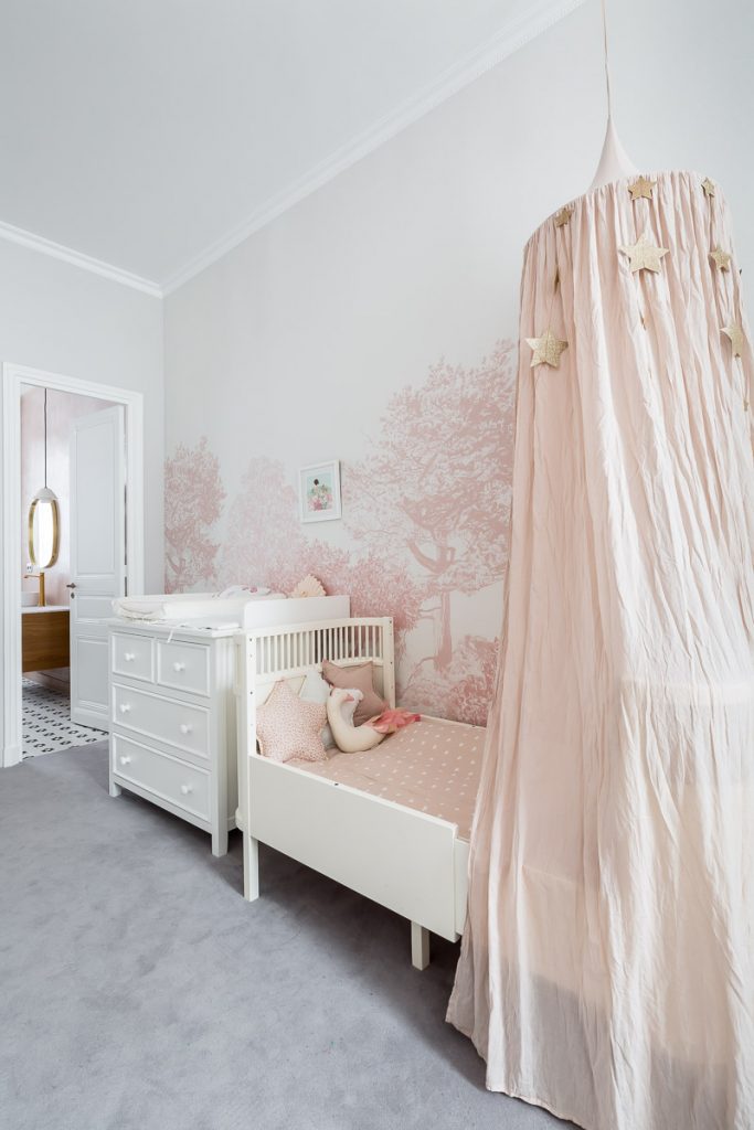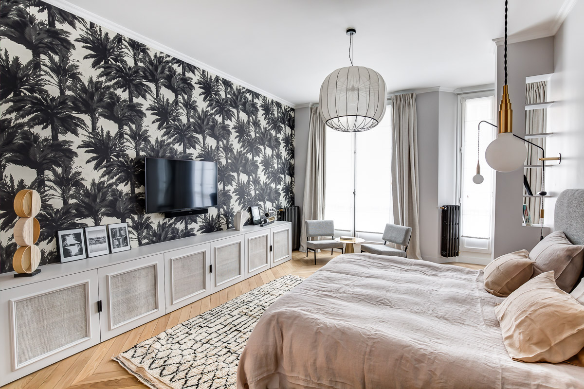 Un meuble bas sur mesure a été réalisé dans toute la longueur de la chambre pour accueillir de nombreux rangements. Les portes ont un cannage à maille serrée pour un look plus contemporain. Papier peint Mauritius de Maison Pierre Frey. Suspension de chez Studio Rik ten Velden. Chauffeuses chinées et retapissées avec un tissus de chez Kvadrat. Appliques de chez Daniel Gallo. Sculpture de chez Wilo & Grove. Rideaux mesrideaux.fr.