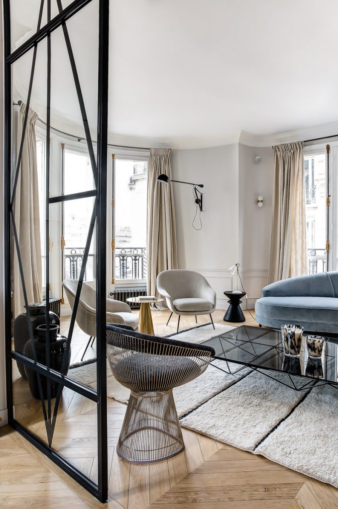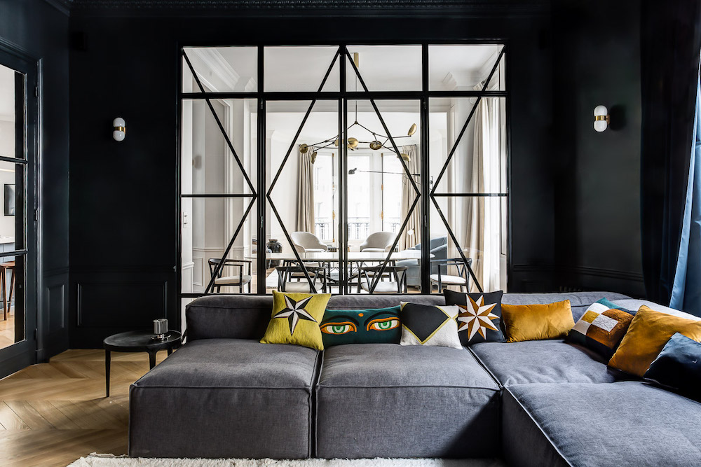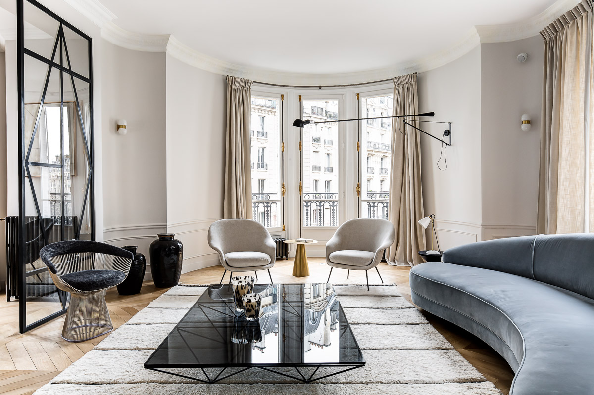 Pour le salon de réception, nous avons voulu l’ouvrir au maximum pour l’intégrer dans cette belle pièce de vie. Ainsi, nous avons supprimé le mur porteur entre la cuisine à gauche et le salon en créant une séparation visuelle avec cette belle verrière aux lignes graphiques, réalisée sur mesure par notre agence. Les lignes graphiques s’associent en finesse avec du mobilier tout en courbe comme ce sublime canapé de chez Phcollection.