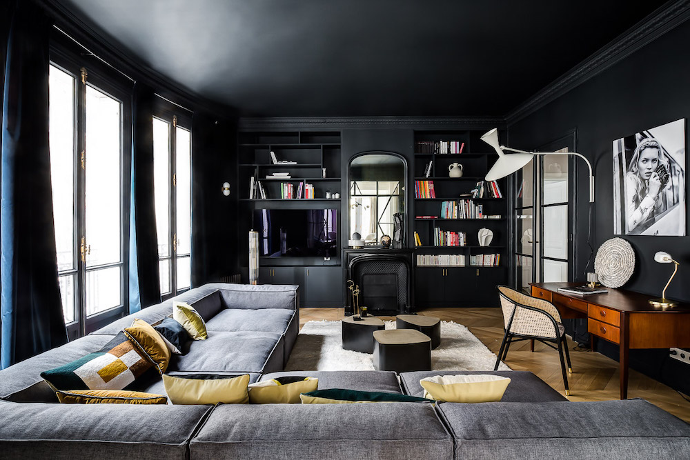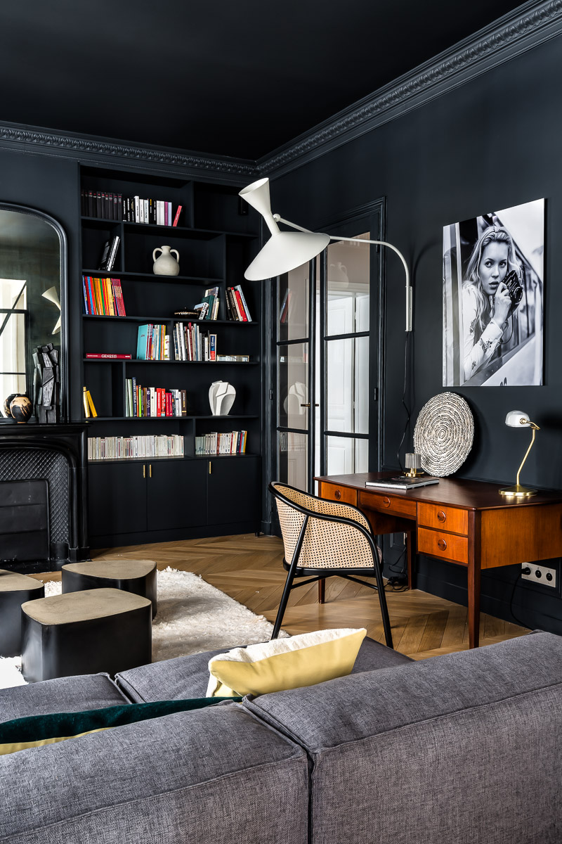 Pour le deuxième salon bibliothèque, nous avons fait le pari d’un total look dark des murs jusqu’au plafond (Référence Railings de chez Farrow & Ball) pour créer un vrai contraste avec le premier salon.