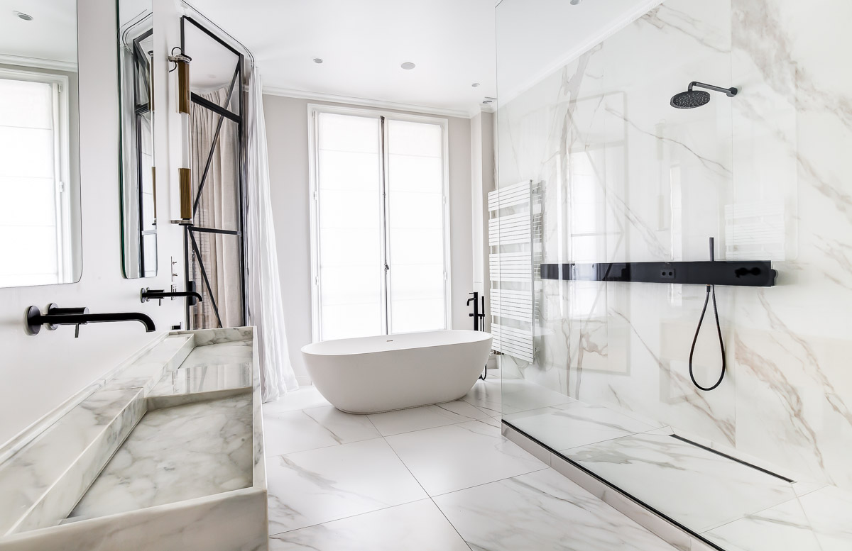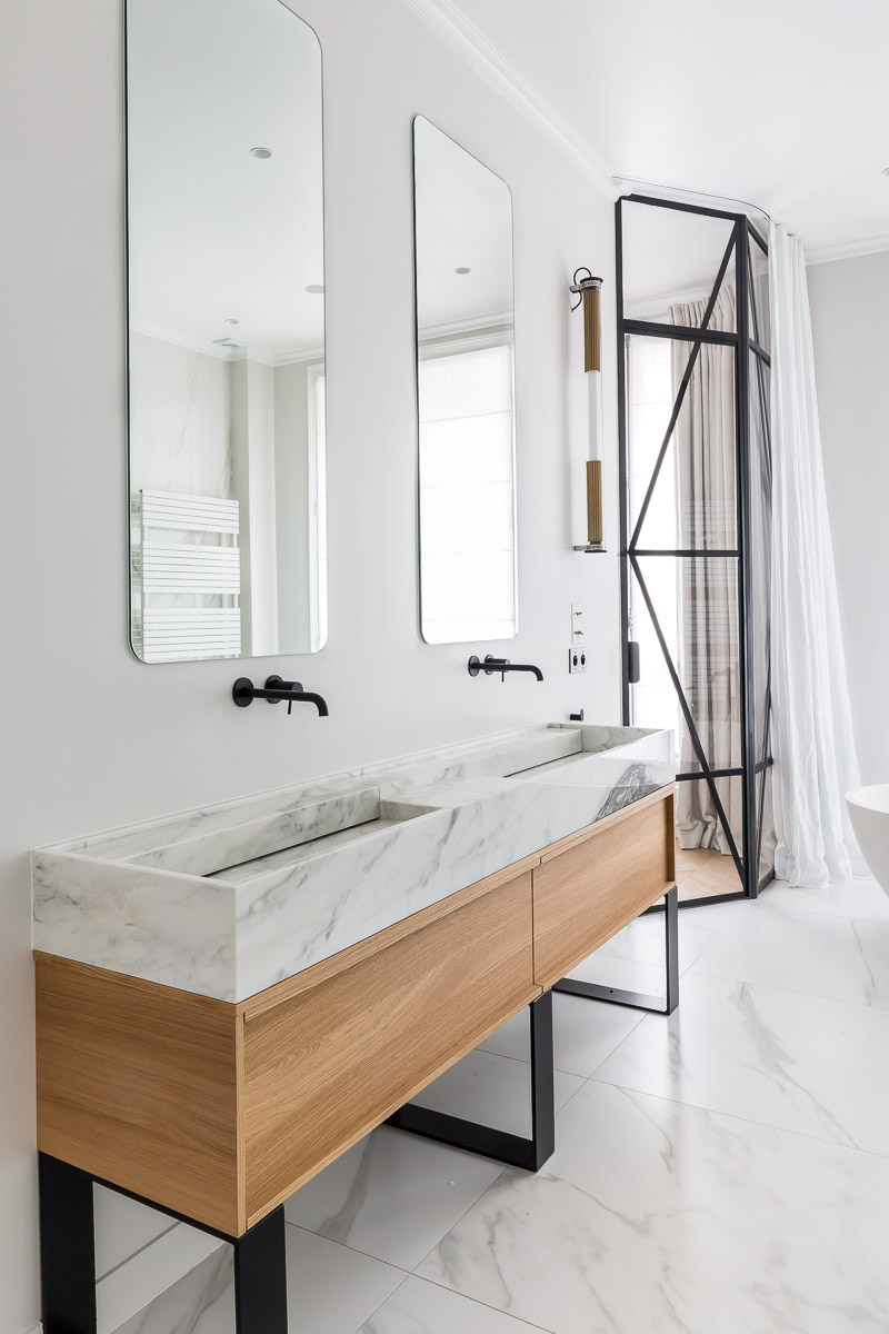 La grande dimension de la salle de bain nous a permis d’y intégrer une très grande douche, une baignoire et un très long meuble vasque en marbre réalisé sur mesure.