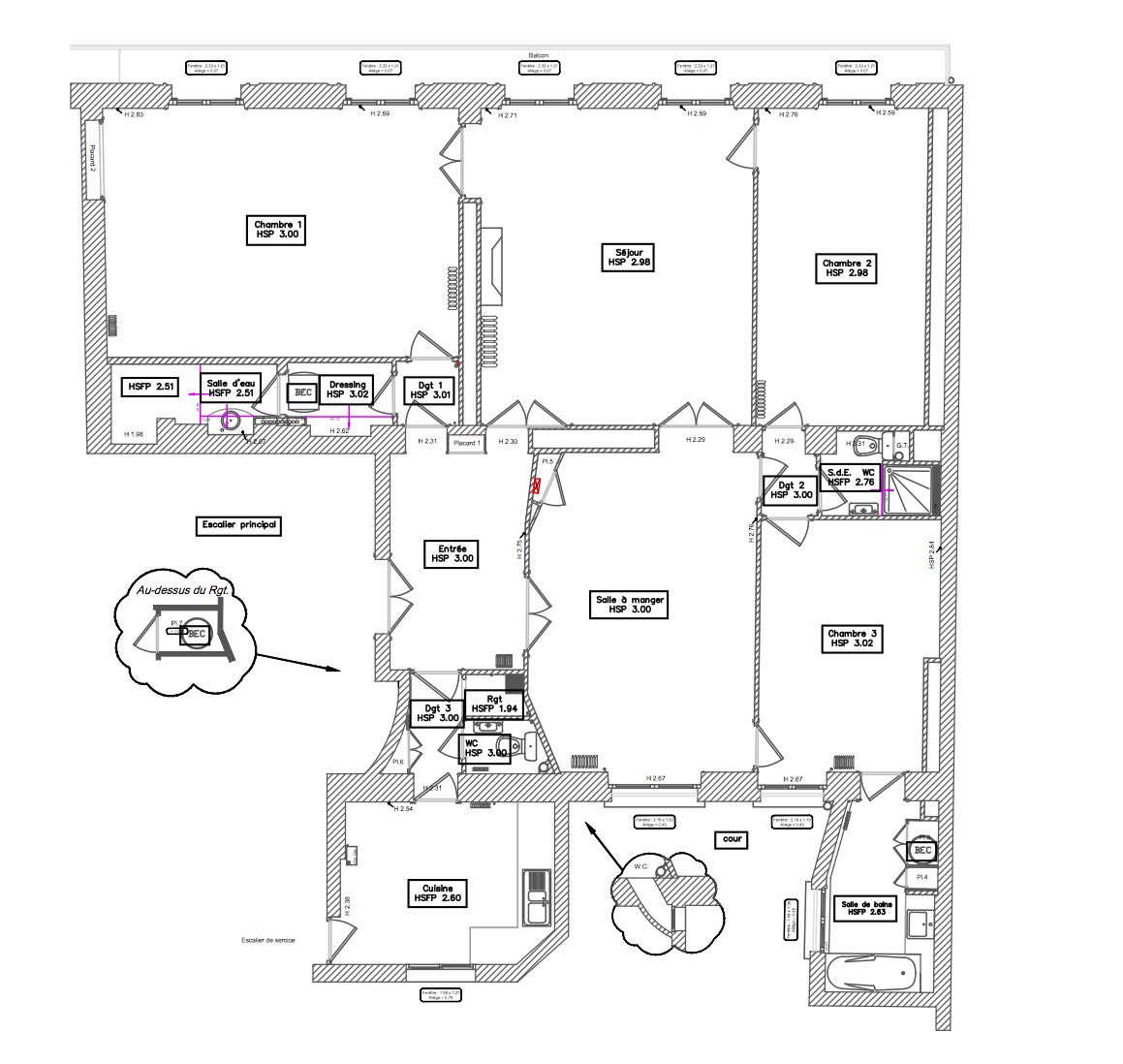 Ici le plan d’origine. Le cahier des charges était conséquent. Il fallait entièrement rénover l’appartement et modifier la distribution des pièces sans toucher aux murs porteurs et à chaque membre de la famille, son espace.
