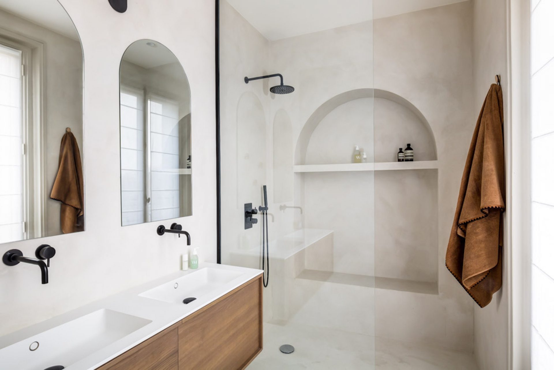 Pour la salle de bain, nous avons utilisé du béton ciré pour garder la luminosité naturelle de l’espace. De quoi prendre son temps et profiter de la vue !