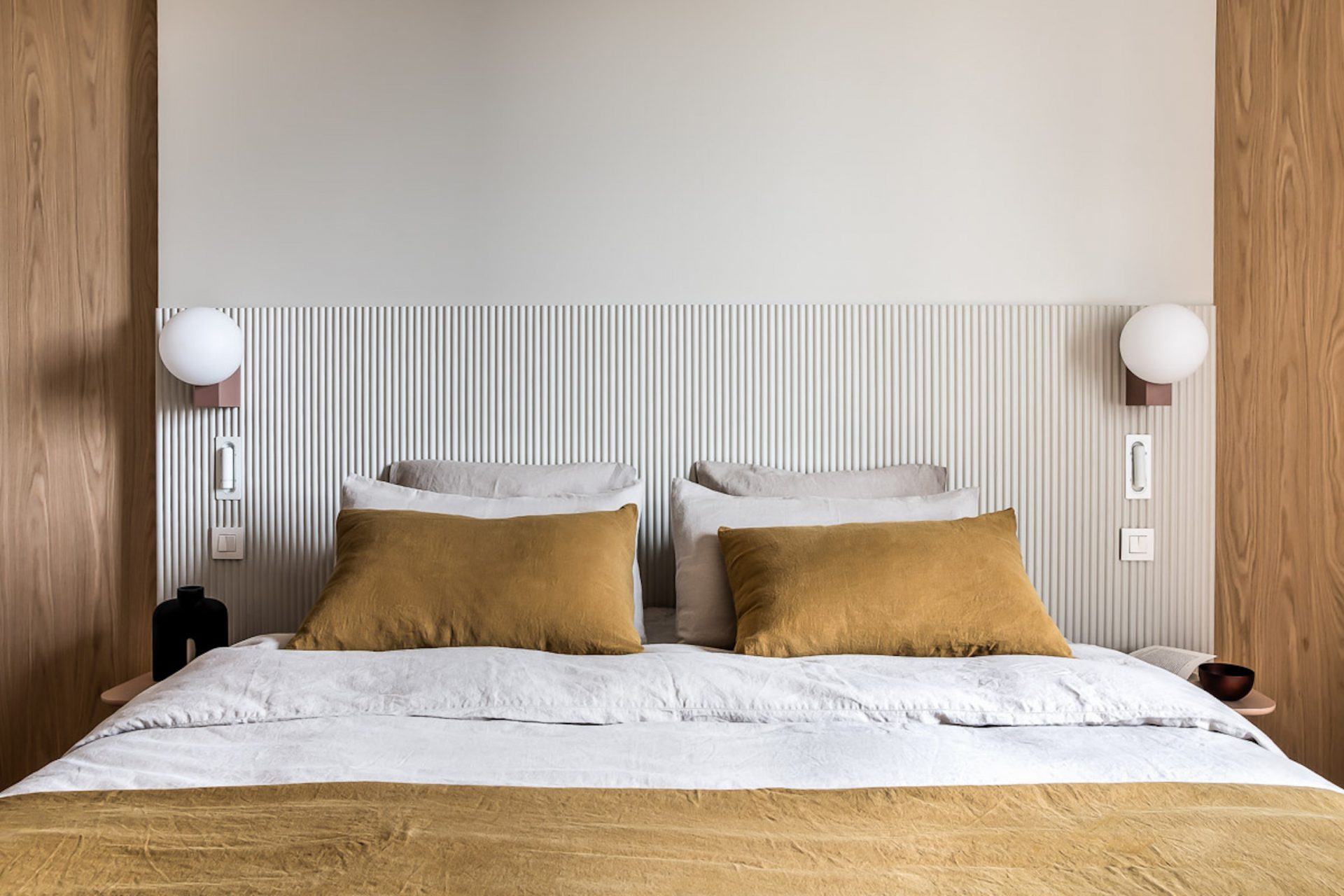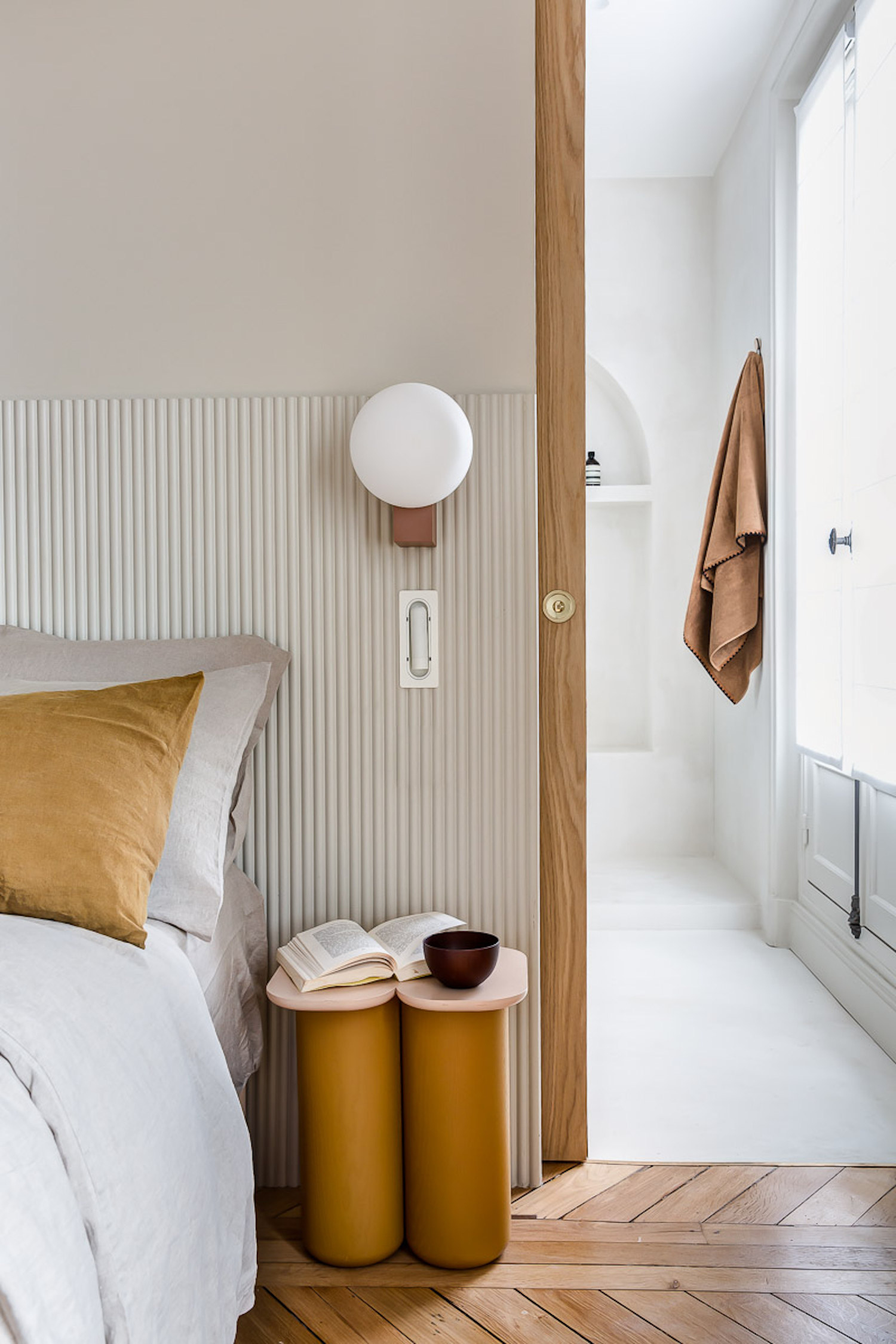 Nous souhaitions une chambre tout en douceur aux couleurs neutres, conserver les courbes élégantes du design de l’appartement via de la tête de lit, les appliques et les chevets pour un intérieur cocooning.