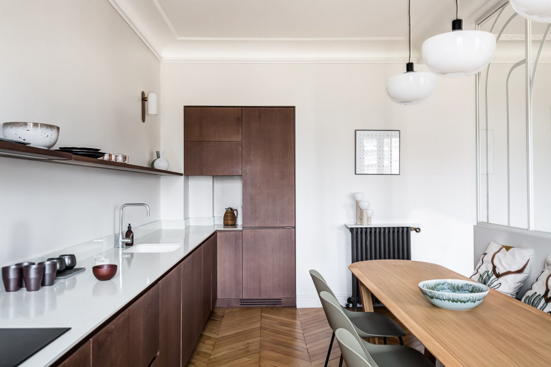 Un espace très convivial où la cuisine a été ouverte sur le salon et séparé par une verrière dessinée et réalisée sur mesure. Les moulures ont été conservées pour garder l’authenticité de la pièce.Ce réagençement offre une profondeur à la pièce et une belle luminosité. Les meubles ont été choisi pour faire de cette pièce un endroit chaleureux et élégant. Des couleurs pastel et de belles matières mises en avant.