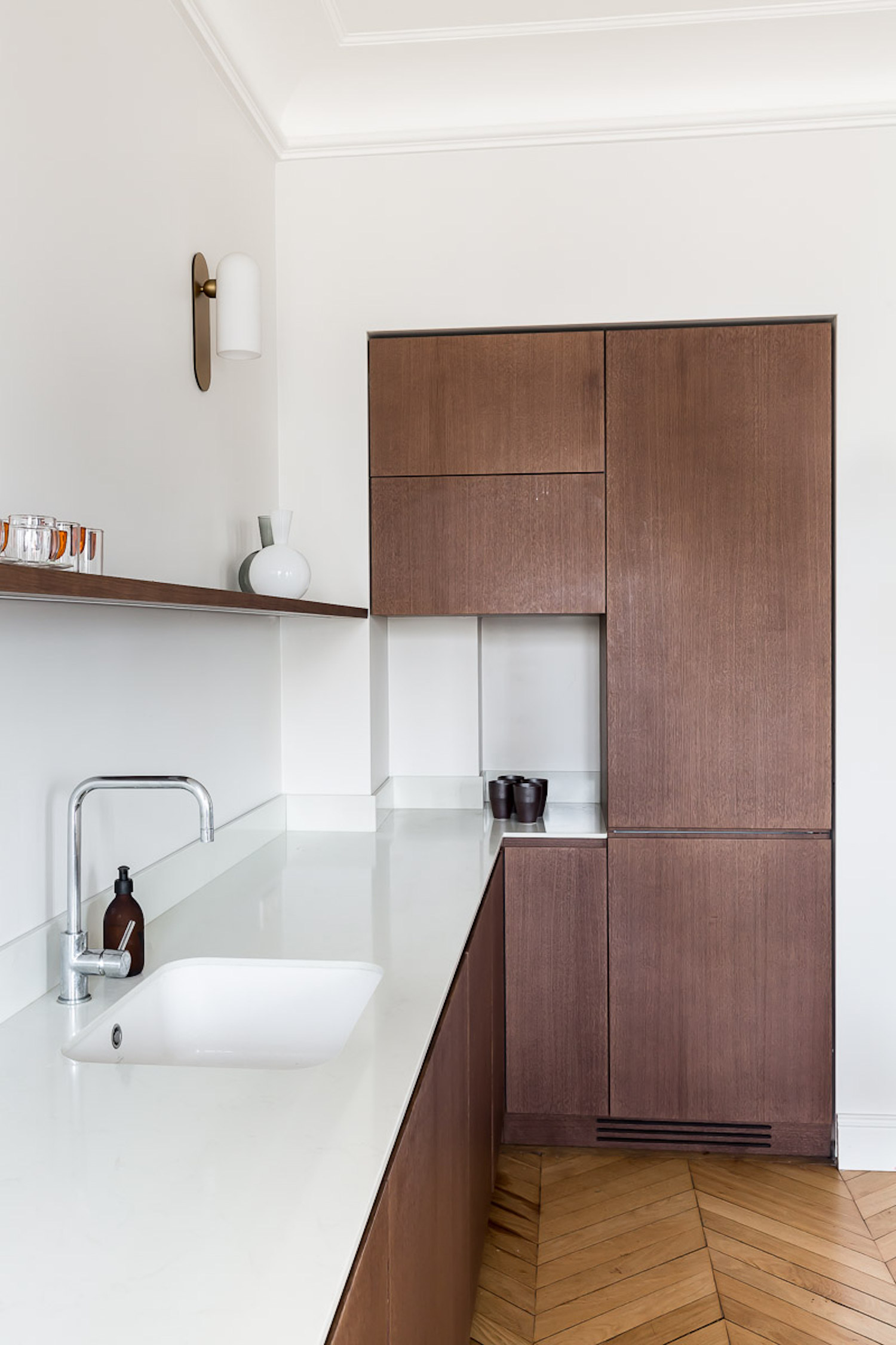 Des portes coulissantes toute hauteur en placage chêne de chaque côté du lit donne de la verticalité à la pièce. Nouvelle cloison donc nouvelles moulures pour conserver son esprit haussmannien.